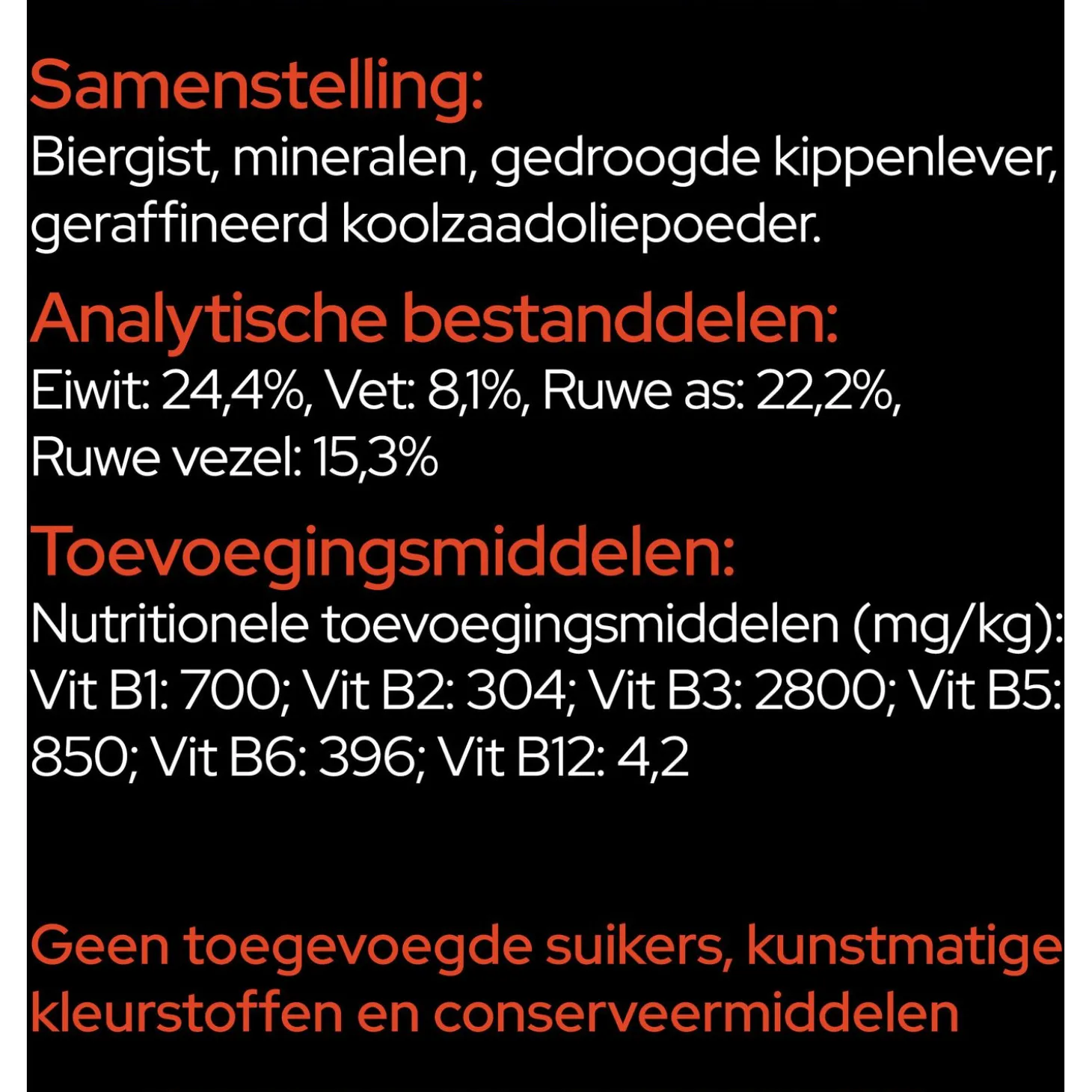 | Samenstelling | Biergist, mineralen, gedroogde kippenlever, geraffineerd koolzaadoliepoeder, vitamine complex (B1, B2, B3, B5, B6, B12) |