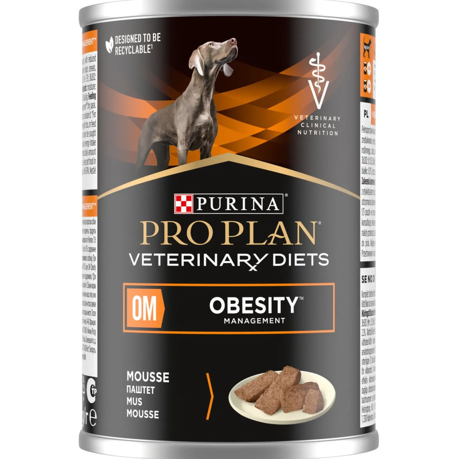 | Analyse | Samenstelling CANINE OM OBESITY MANAGEMENTBelangrijkste voedingswaarden*NatvoerVochtgehalte79,5%Eiwitten8,8%Vetten2,5%- Linolzuur0,48%Koolhydraten2,8%- Zetmeel0,9%- Totaal aan suikers0,9%Ruwe vezels4,4%Oplosbare vezels0,3%Onoplosbare vezels5,5%Vitamine E70 mg/kgMetaboliseerbare energie (ME)10,62 kcal/g* Standaard analyse in het eindproduct zoals gevoerd.1 Berekend op basis van gewijzigde Atwaterfactoren. |