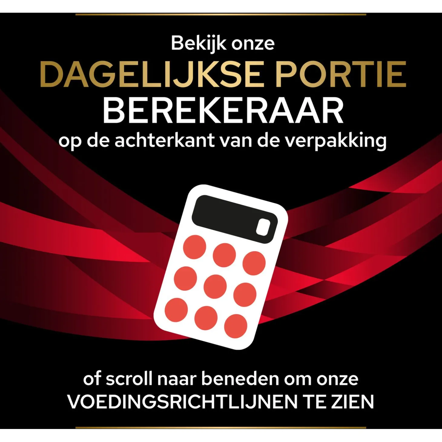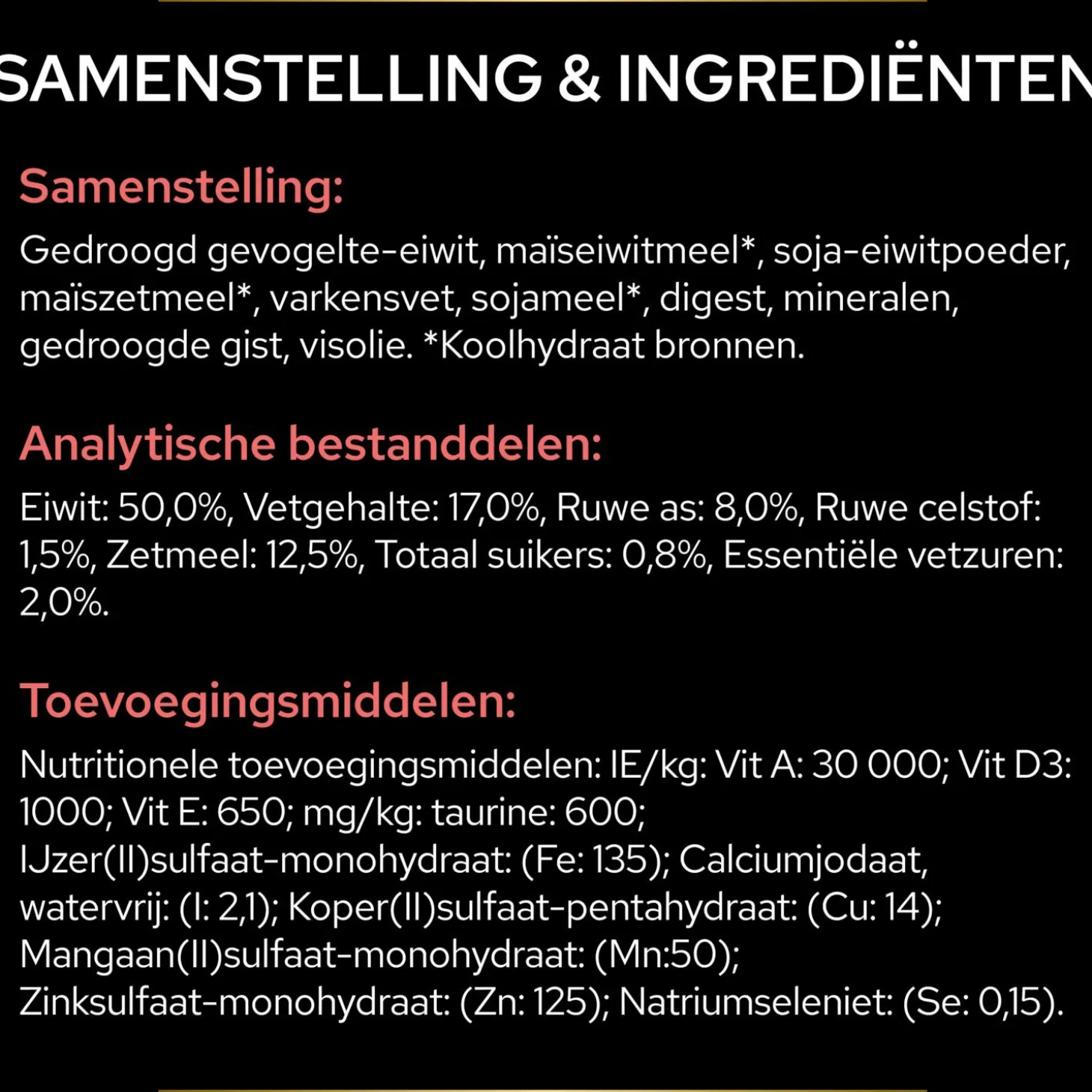 | Samenstelling | Gedehydrateerd gevogelte-eiwit, maisglutenmeel, soja-eiwitisolaat, maiszetmeel*, dierlijk vet, sojameel*, digest, mineralen, gist, visolie.*Koolhydraatbronnen. |