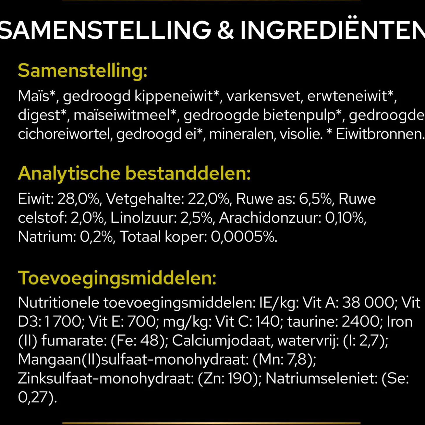 | Samenstelling | Maïs *, gedehydrateerde kippenproteïne *, maïsgluten *, dierlijk vet, hydrolysaat *, eipoeder *, gedehydrateerde bietenpulp *, gedehydrateerde cichoreiwortel, minerale stoffen, visolie.*Eiwitbronnen. |