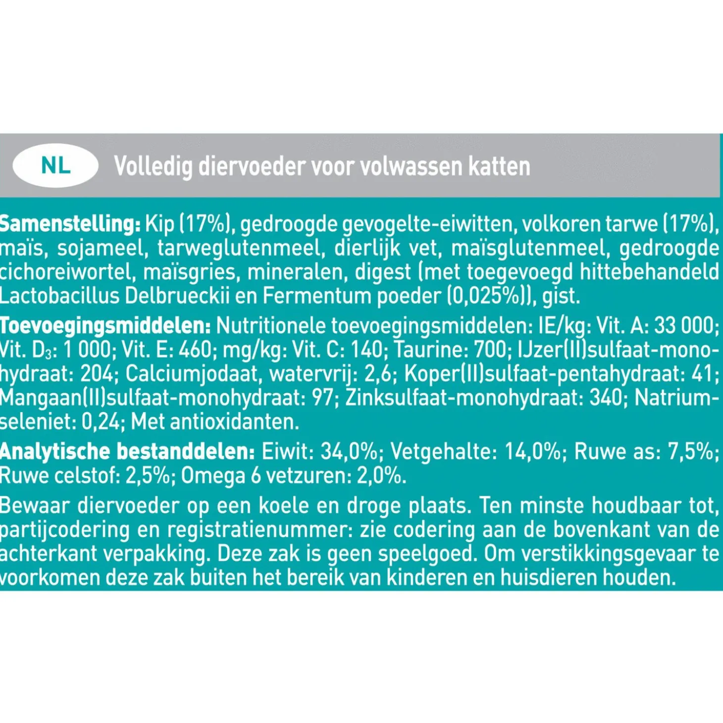 | Samenstelling | Samenstelling: Kip (inclusiefbot, vlees, huid) (17%), Gedroogd gevogelte-eiwit, Tarwe (16%), Maïs, Sojameel, Tarwegluten, Dierlijke vetten, Maïseiwitmeel, Gedroogde cichoreiwortel (2%), Maïsgrutten, Mineralen, Digest (met toegevoegde hitte behandelde Lactobacillus Delbrueckii en Fermentum-poeder 0,025%), Gedroogd gist. |