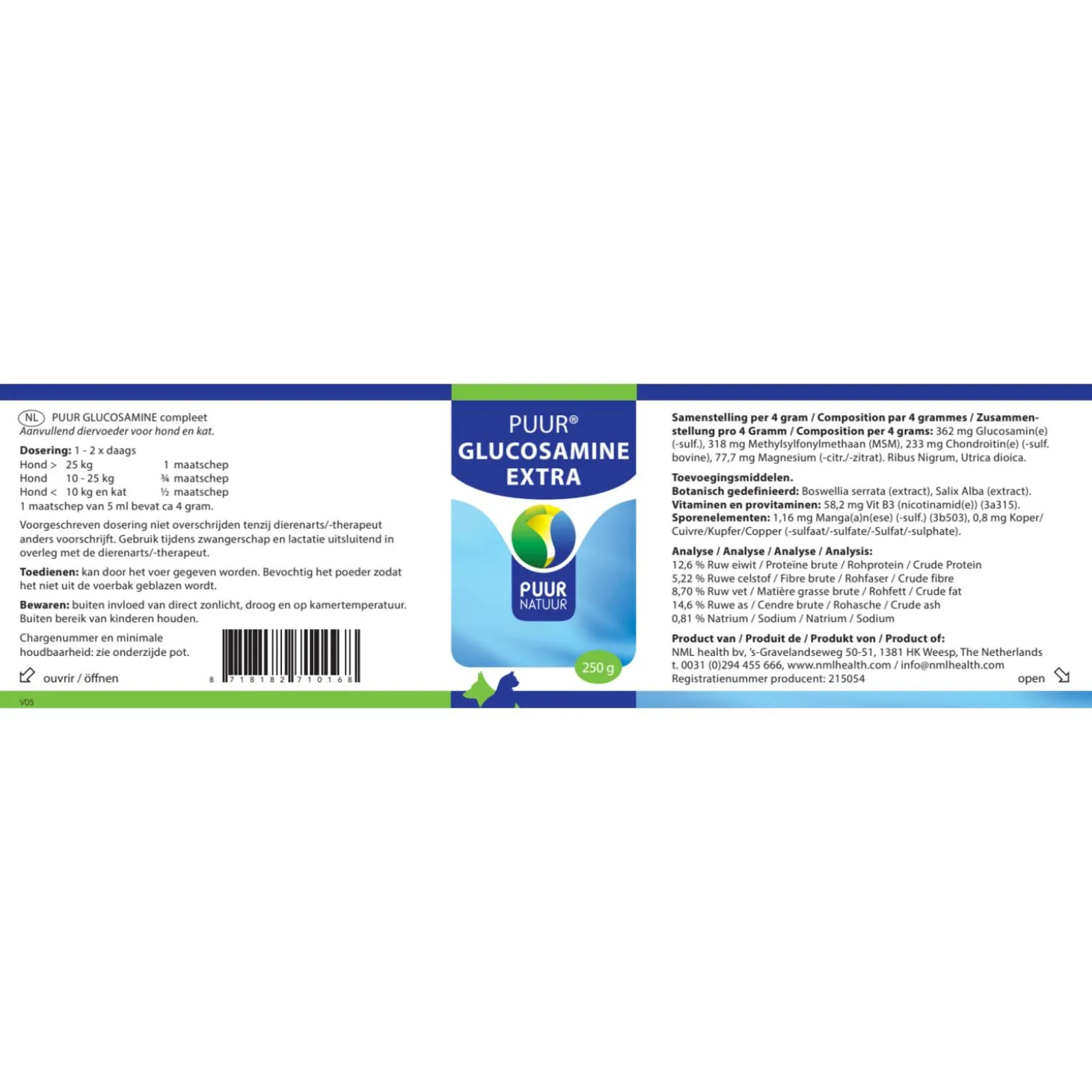| Samenstelling | Samenstelling per 4 gram / Composition par 4 grammes / Zusammenstellung pro 4 Gramm / Composition per 4 grams: 362 mg Glucosamin(e) (-sulf.), 318 mg Methylsylfonylmethaan (MSM), 233 mg Chondroitin(e) (-sulf. bovine), 77,7 mg Magnesium (-citr./-zitrat). Ribus Nigrum, Utrica dioica. Toevoegingsmiddelen. Botanisch gedefinieerd: Boswellia serrata (extract), Salix Alba (extract). Vitaminen en provitaminen: 58,2 mg Vit B3 (nicotinamid(e)) (3a315). Sporenelementen: 1,16 mg Manga(a)n(ese) (-sulf.) (3b503), 0,8 mg Koper/ Cuivre/Kupfer/Copper (-sulfaat/-sulfate/-Sulfat/-sulphate). |