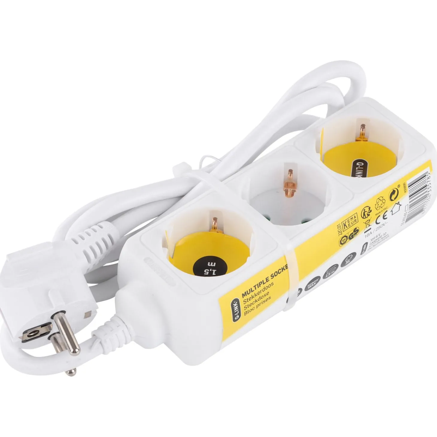 - Stekkerdoos met 1,5 meter snoer en stekker met penaarde 3×1.5mm, 3 voudig 3 stopcontacten met randaarde, in de kleur: wit