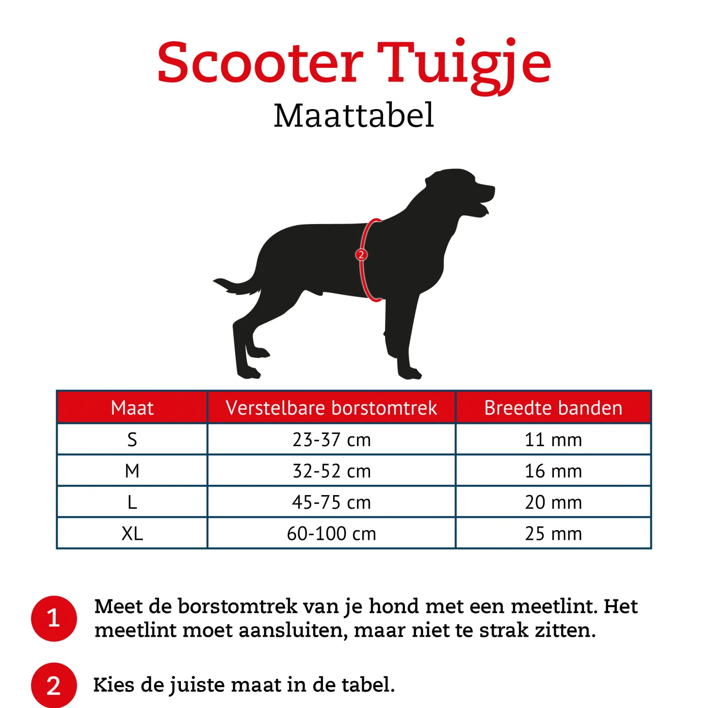 Het is natuurlijk belangrijk dat een tuig de juiste pasvorm heeft. Gebruik onderstaande tabel als leidraad voor het kiezen van de juiste maat. Je kunt je hond het beste opmeten met een flexibel meetlint. Zorg dat er zo’n 1 à 2 vingers aan ruimte overblijft tussen het lint en je hond, zodat het tuig niet te strak zit en je hond zich er prettig in kan bewegen.