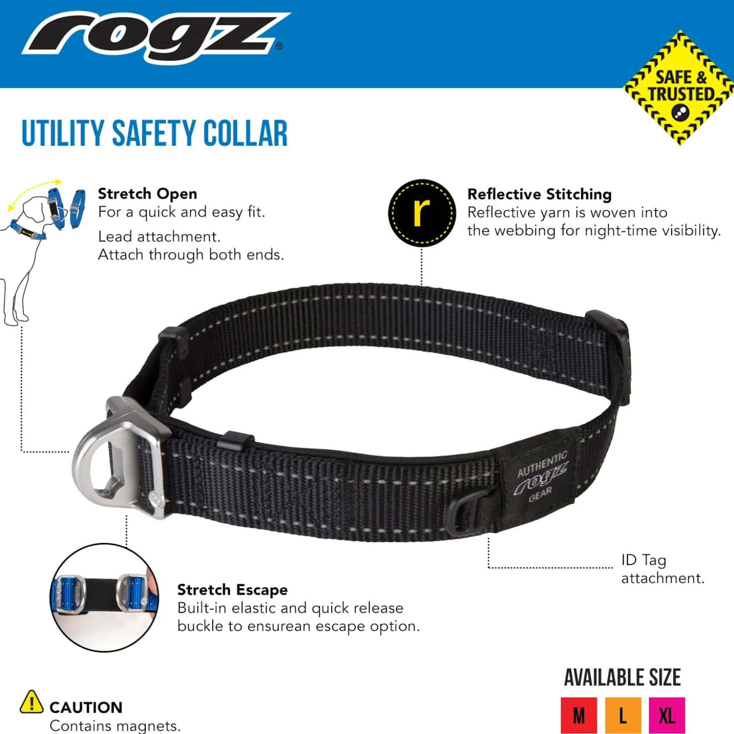 De Rogz Utility Safety Halsband is een kunststof veiligheidshalsband voor je hond. Deze unieke halsband is voorzien van een magnetische sluiting met daaronder een elastiek. Als je hond losloopt in bijvoorbeeld het bos en hij blijft met zijn halsband haken achter een tak, zorgt de Safety halsband ervoor dat hij eenvoudig kan ontsnappen. Dankzij het elastiek wordt de halsband uitgerekt zodat je hond niet vast blijft hangen.