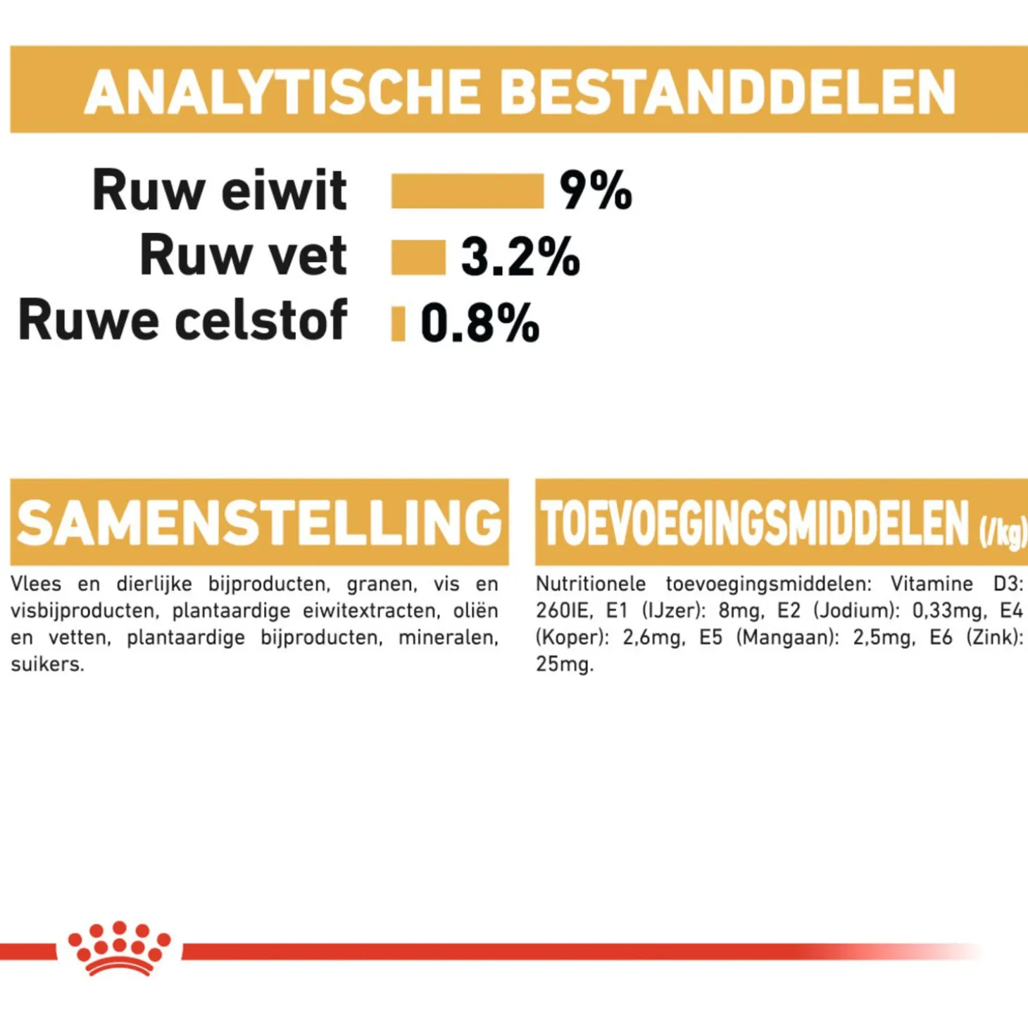 | Samenstelling | Vlees en dierlijke bijproducten, granen, vis en -bijproducten, plantaardige eiwitextracten, oliën en vetten, plantaardige bijproducten, mineralen, suiker |