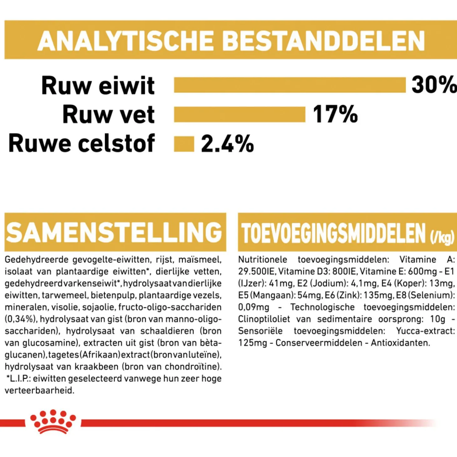 | Samenstelling | Rijst, gedehydreerde gevogelte-eiwitten, dierlijke vetten, isolaat van plantaardige eiwitten*, gedehydreerd varkenseiwit*, hydrolysaat van dierlijke eiwitten, plantaardige vezels, bietenpulp, mineralen, visolie, sojaolie, hydrolysaat van gist (bron van manno-oligo-sacchariden), hydrolysaat van schaaldieren (bron van glucosamine), tagetes (afrikaan) extract (bron van luteïne), hydrolysaat van kraakbeen (bron van chondroïtine), maïsmeel, tarwemeel, fructi-oligo-sacchariden (0,34%), extracten uit gist (bron van bètaglucanen) *l.i.p.: hoogwaardige eiwitten die zeer goed verteerbaar zijn. |