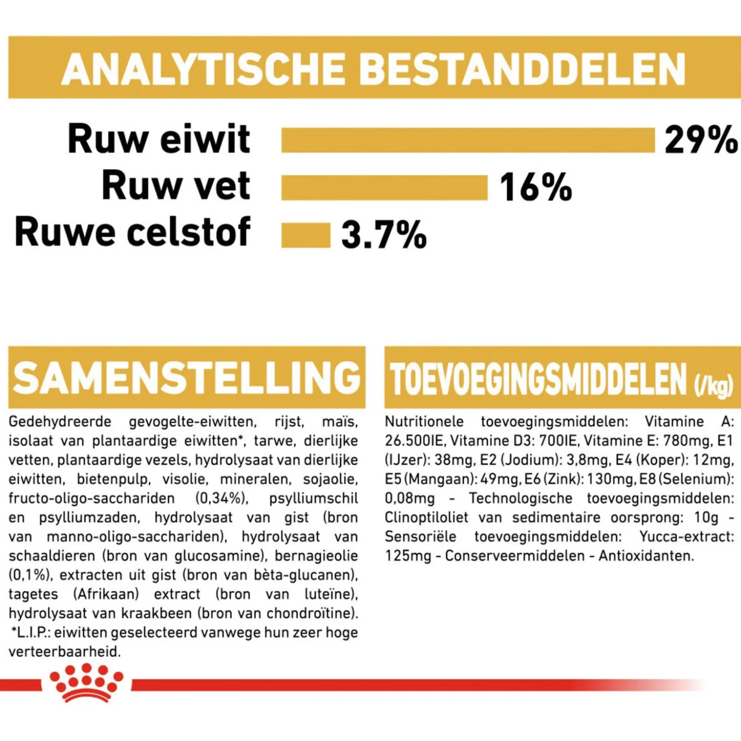 | Samenstelling | Gedehydreerde gevogelte-eiwitten, rijst, maïs, isolaat van plantaardige eiwitten*, dierlijke vetten, tarwe, plantaardige vezels, hydrolysaat van dierlijke eiwitten, bietenpulp, mineralen, visolie, sojaolie, psylliumschil en psylliumzaden, hydrolysaat van gist (bron van manno-oligo-sacchariden), hydrolysaat van schaaldieren (bron van glucosamine), bernagieolie (0.1%), tagetes (afrikaan) extract (bron van luteïne), hydrolysaat van kraakbeen (bron van chondroïtine), fructi-oligo-sacchariden (0,34%), extracten uit gist (bron van bètaglucanen) *l.i.p.: hoogwaardige eiwitten die zeer goed verteerbaar zijn. |