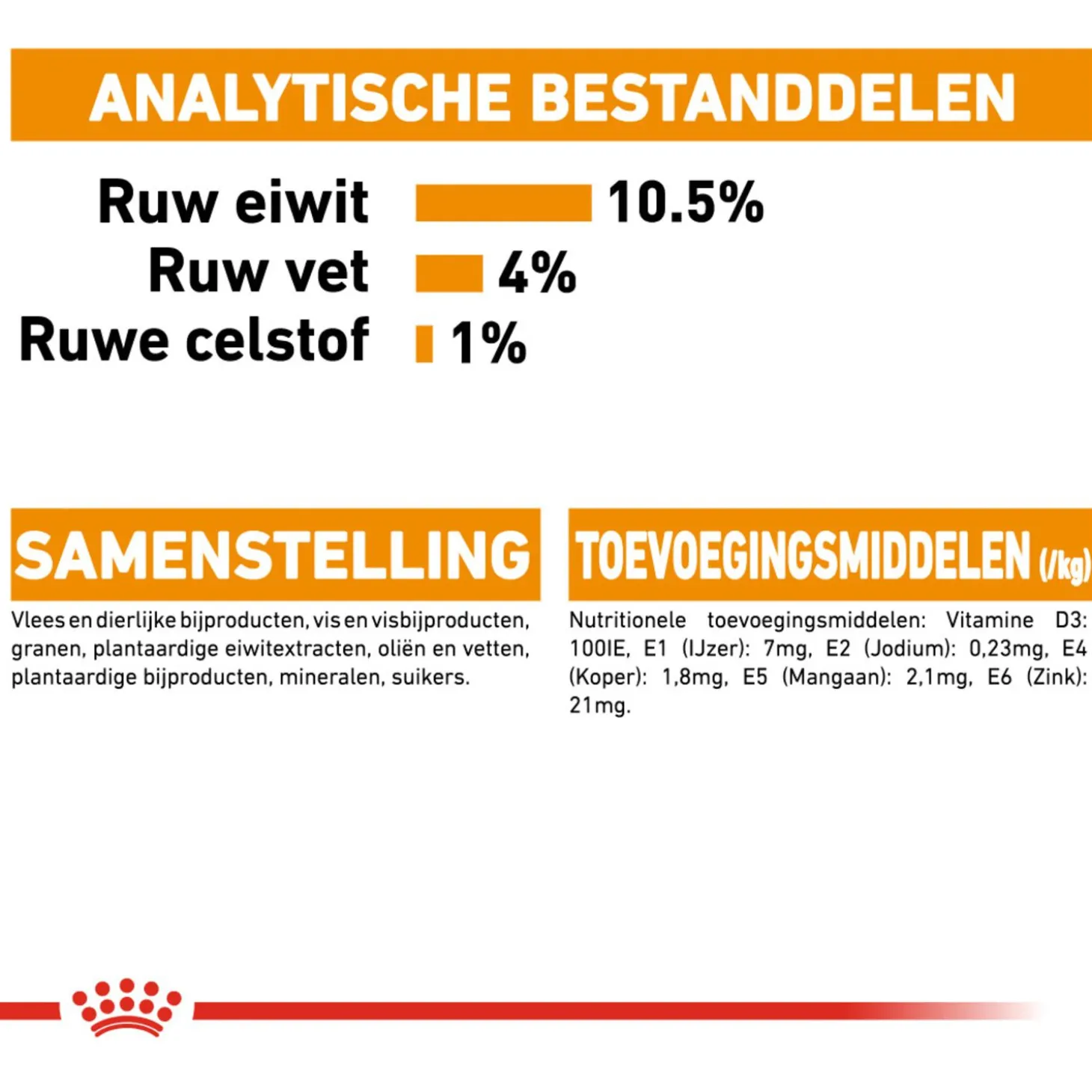 | Analyse | Ruw vet: 4.00 %, Ruwe as: 1.50 %, Ruwe celstof: 1.00 %, Vochtgehalte: 81.00 %, Omega-3 vetzuren: 0.23 g, Omega-6 vetzuren: 1.20 g, Ruw eiwit: 10.50 % |