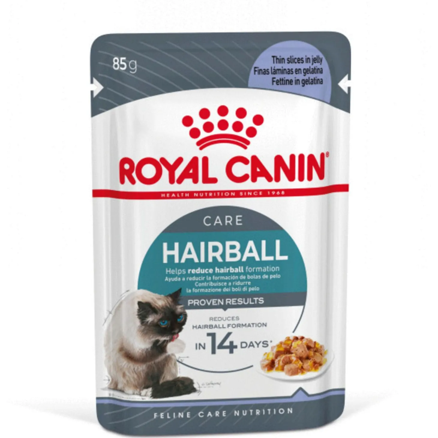 ROYAL CANIN® Hairball Care in Jelly (brokjes in gelei) is een complete en uitgebalanceerde voeding die speciaal is ontwikkeld om de vorming van haarballen te helpen verminderen. Deze voeding is samengesteld om de darmpassage te helpen bevorderen en zo ingeslikte haren te laten uitscheiden. ROYAL CANIN® Hairball Care heeft bewezen resultaten. Uit een interne studie* van Royal Canin blijkt dat deze voeding de vorming van haarballen bij de deelnemende katten na 14 dagen gebruik van het Hairball Care-voedingsprogramma vermindert.