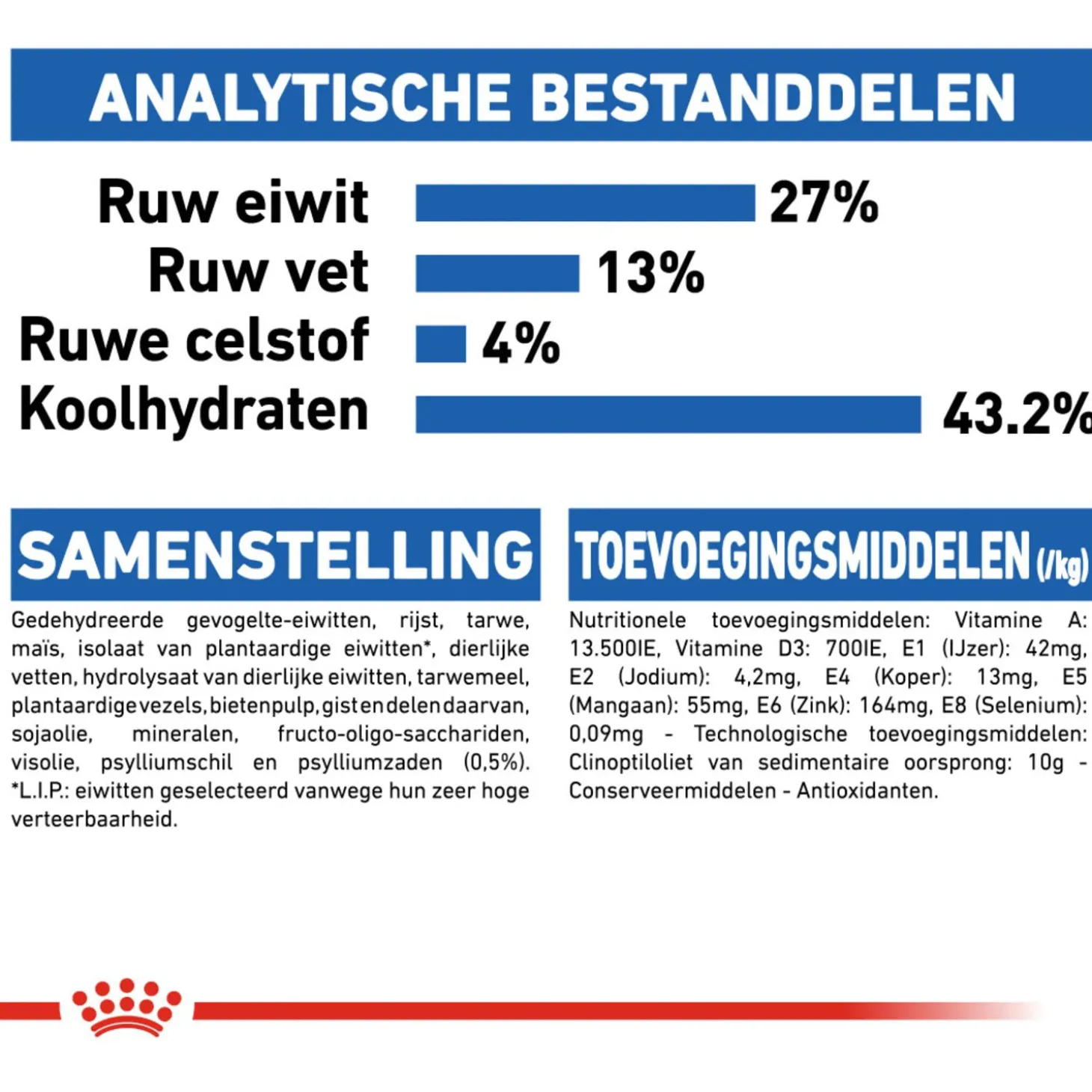 | Samenstelling | Maïs, rijst, isolaat van plantaardige eiwitten*, tarwe, dierlijke vetten, hydrolysaat van dierlijke eiwitten, plantaardige vezels, mineralen, bietenpulp, sojaolie, fructo-oligo-sacchariden, visolie, gedehydreerde gevogelte-eiwitten, tarwemeel, gist en delen daarvan, psylliumschil en psylliumzaden (0,5%) *l.i.p.: hoogwaardige eiwitten die zeer goed verteerbaar zijn. |