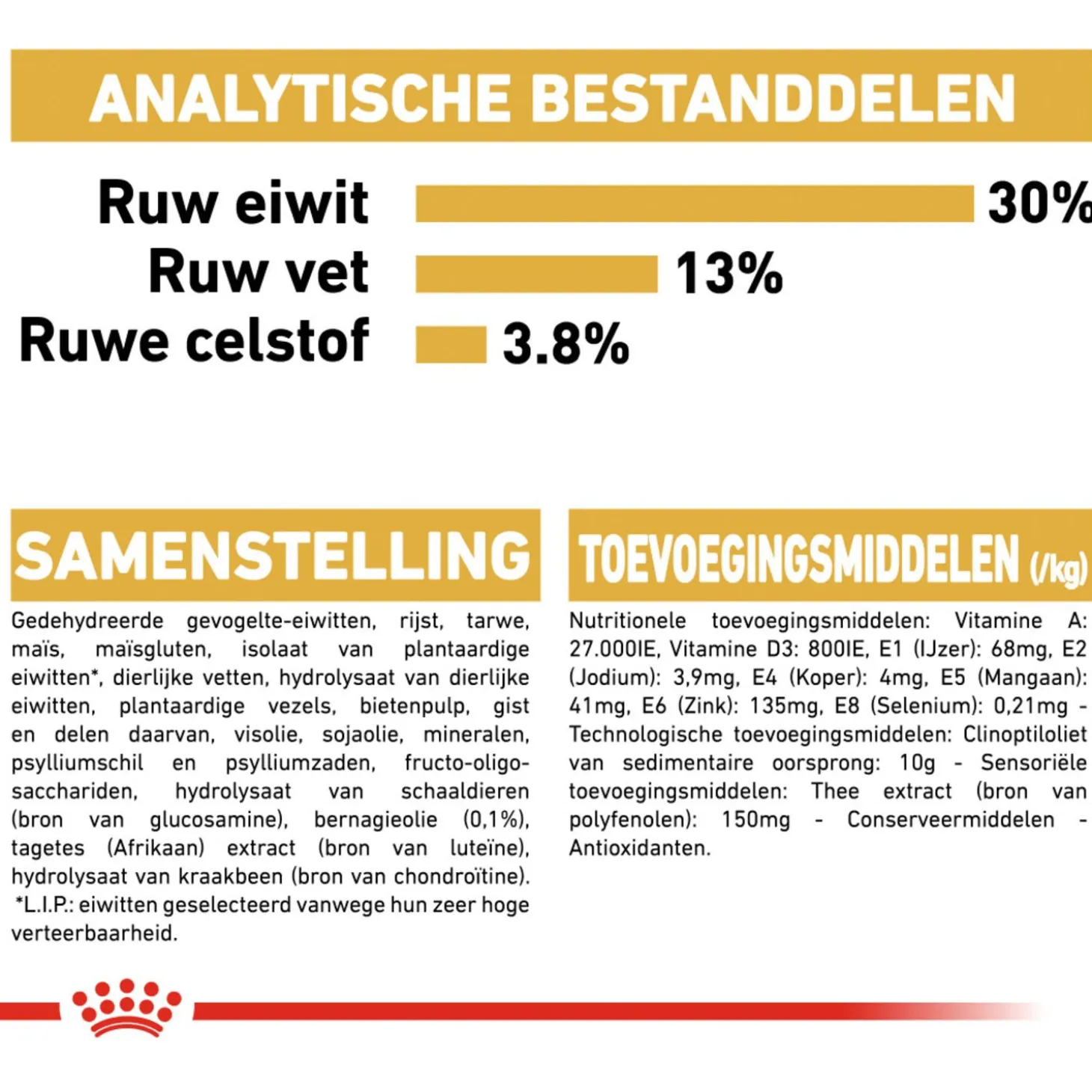 | Samenstelling | Rijst, maïs, gedehydreerde gevogelte-eiwitten, maïsgluten, dierlijke vetten, hydrolysaat van dierlijke eiwitten, plantaardige vezels, mineralen, bietenpulp, visolie, sojaolie, psylliumschil en psylliumzaden, fructo-oligo-sacchariden, hydrolysaat van schaaldieren (bron van glucosamine), bernagieolie (0,1%), tagetes (afrikaan) extract (bron van luteïne), hydrolysaat van kraakbeen (bron van chondroïtine), gedehydreerd runder- en varkenseiwit*, tarwe, gist en delen daarvan *l.i.p.: hoogwaardige eiwitten die zeer goed verteerbaar zijn. |