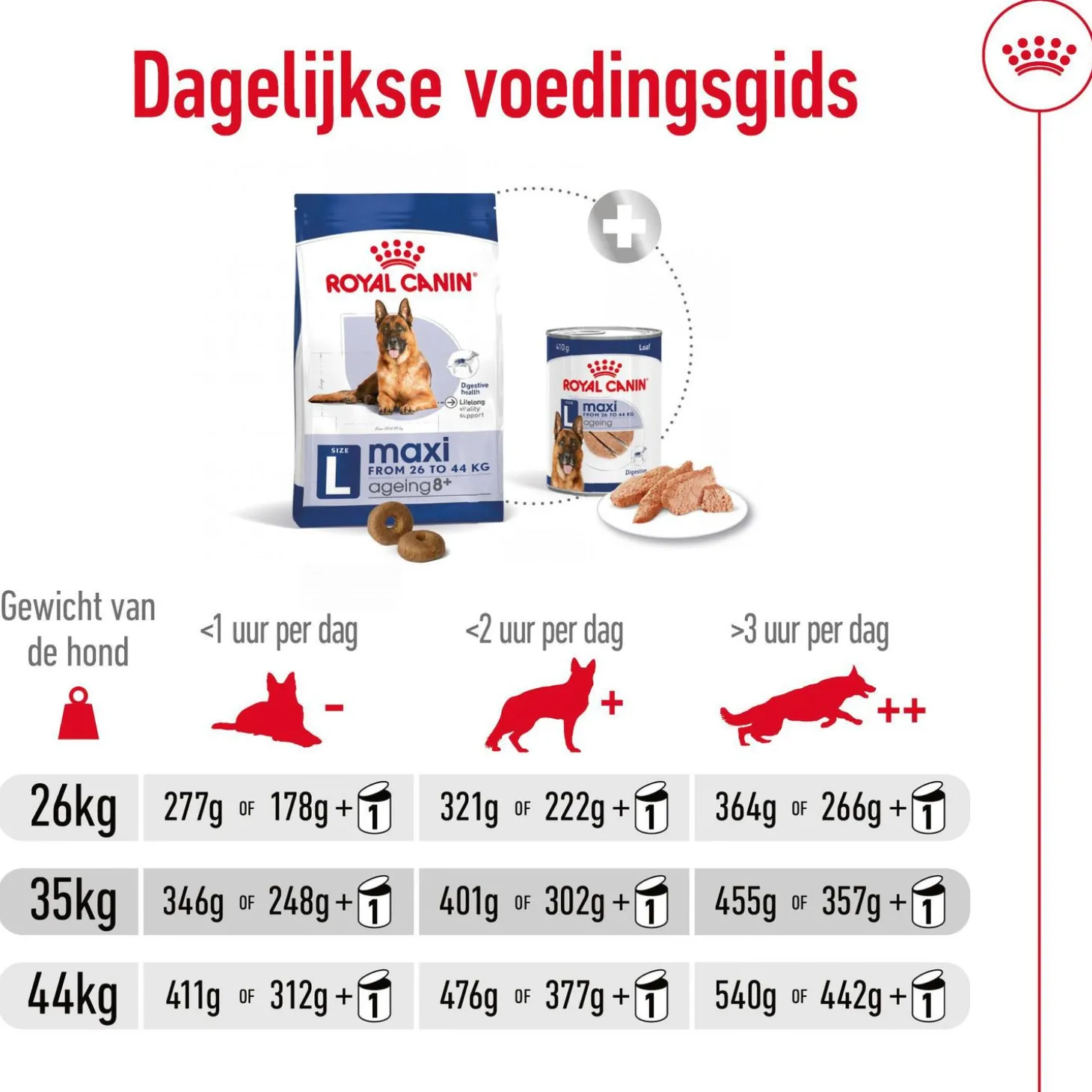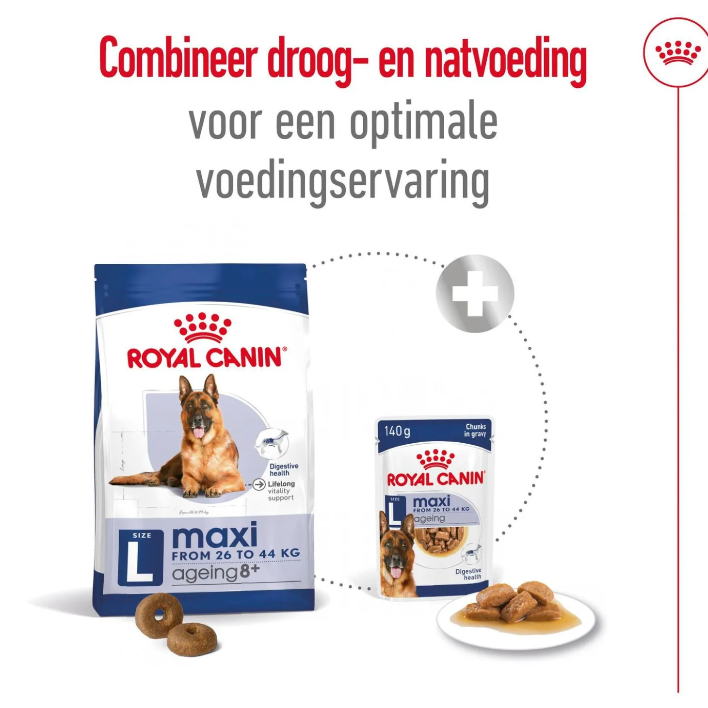 Royal Canin Maxi Ageing 8+ is samengesteld met de voedingsbehoeften van je oudere hond in het achterhoofd en is geschikt voor grote honden van 8 jaar en ouder, met een volwassen gewicht van 26 tot 44 kilogram.