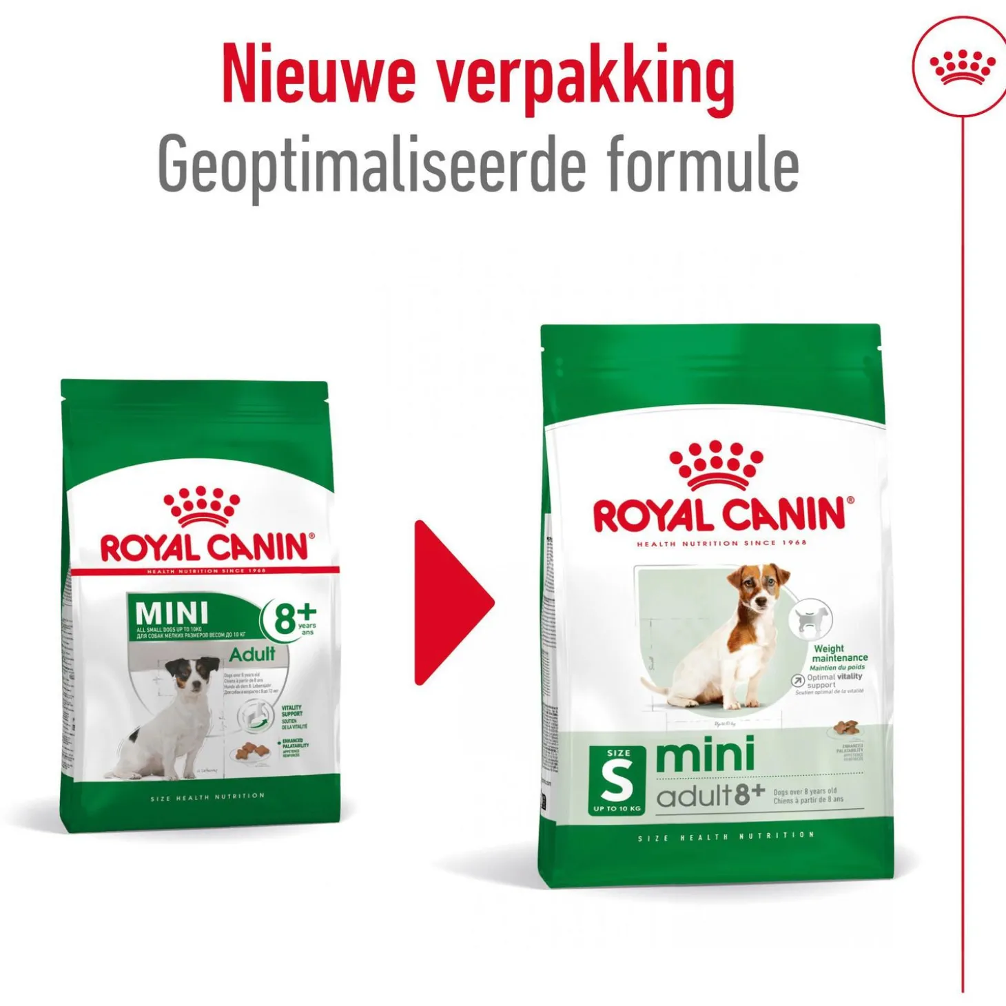 Royal Canin Mini Adult 8+ is verkrijgbaar in 800 gr, 2 kg, 4 kg en 8 kg.
