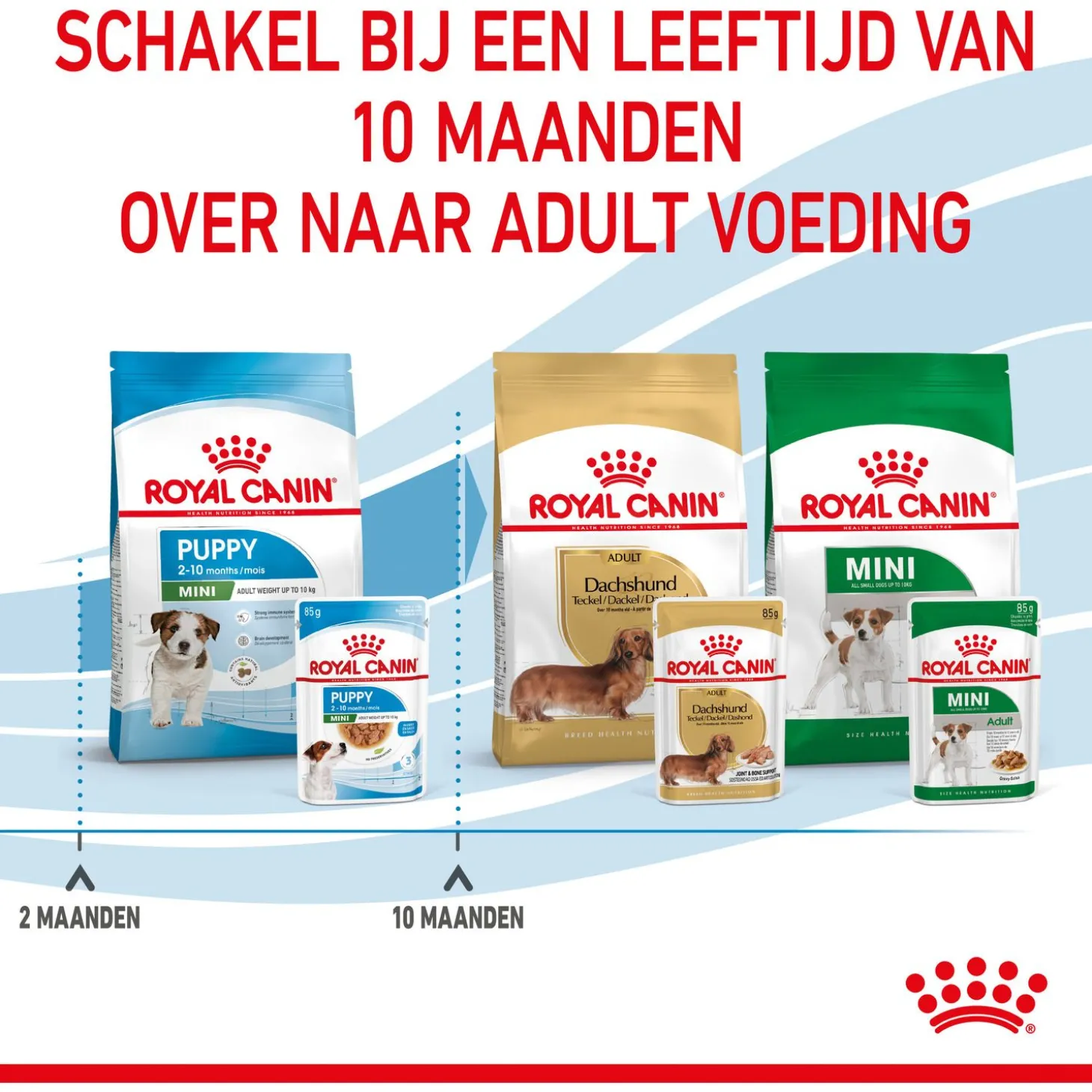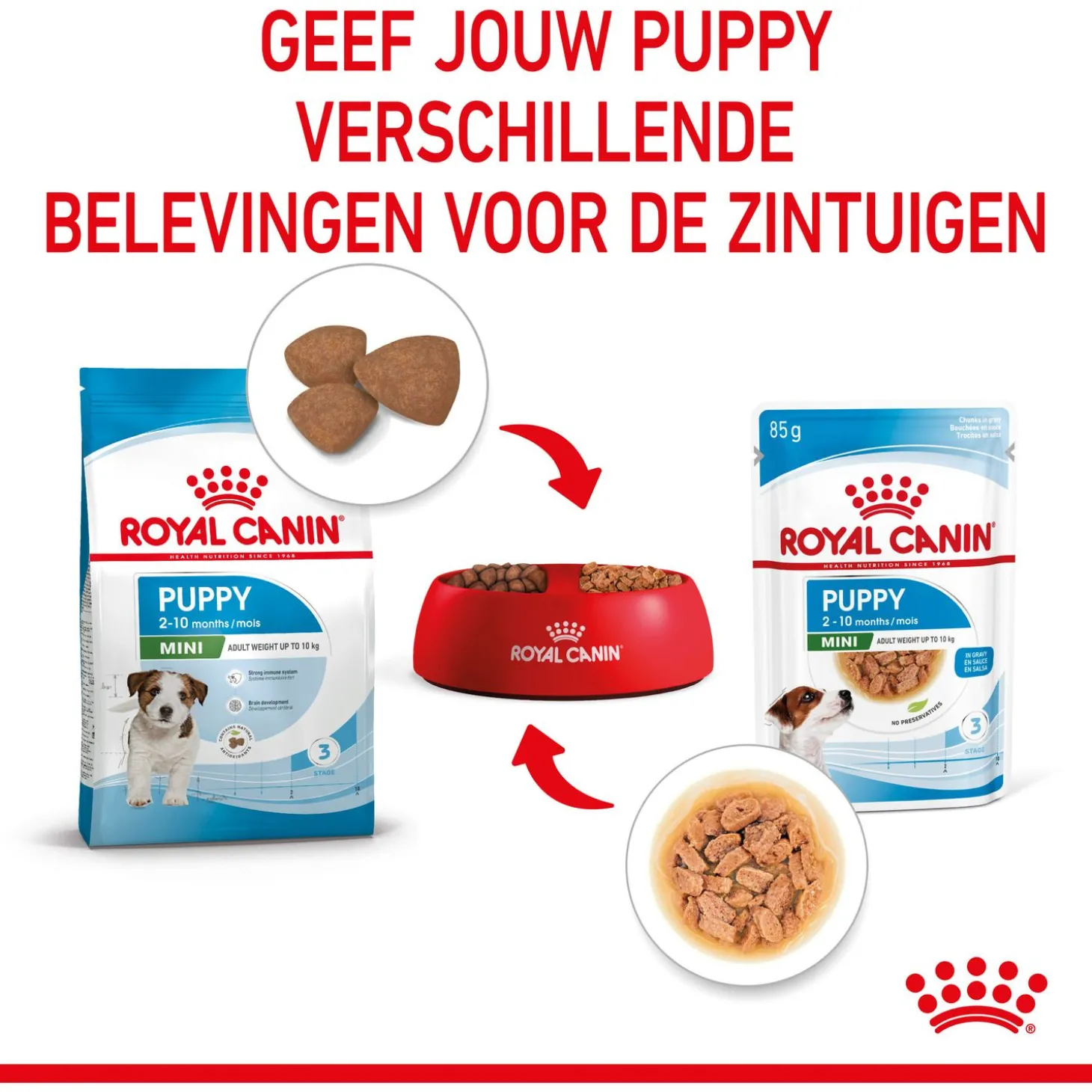Zelfs de meest kieskeurige pups zullen smullen van Royal Canin Mini Puppy in Saus. De natvoeding biedt een fijne zintuigelijke ervaring, hydrateert het lichaam en kan daardoor ook perfect gecombineerd worden met de brokken van Royal Canin Mini Puppy.