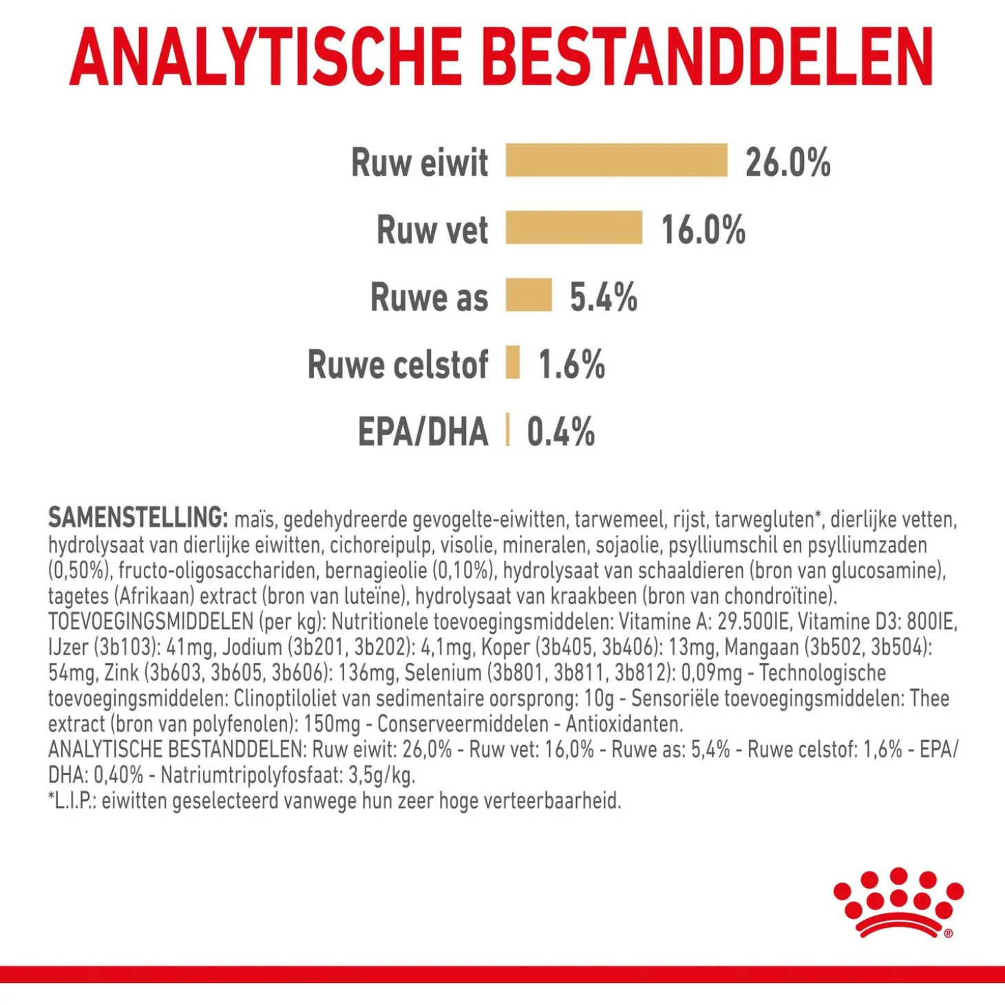 | Analyse | Ruw eiwit: 26,0% – Ruw vet: 16,0% – Ruwe as: 5,4% – Ruwe celstof: 1,6% – EPA/DHA: 0,40% – Natriumtripolyfosfaat: 3,5g/kg. Nutritionele toevoegingsmiddelen: Vitamine A: 29.500IE, Vitamine D3: 800IE, IJzer (3b103): 41mg, Jodium (3b201, 3b202): 4,1mg, Koper (3b405, 3b406): 13mg, Mangaan (3b502, 3b504): 54mg, Zink (3b603, 3b605, 3b606): 136mg, Selenium (3b801, 3b811, 3b812): 0,09mg. Technologische toevoegingsmiddelen: Clinoptiloliet van sedimentaire oorsprong: 10g. Sensoriële toevoegingsmiddelen: Thee extract (bron van polyfenolen): 150mg – Conserveermiddelen – Antioxidanten. *L.I.P.: eiwitten geselecteerd vanwege hun zeer hoge verteerbaarheid. |