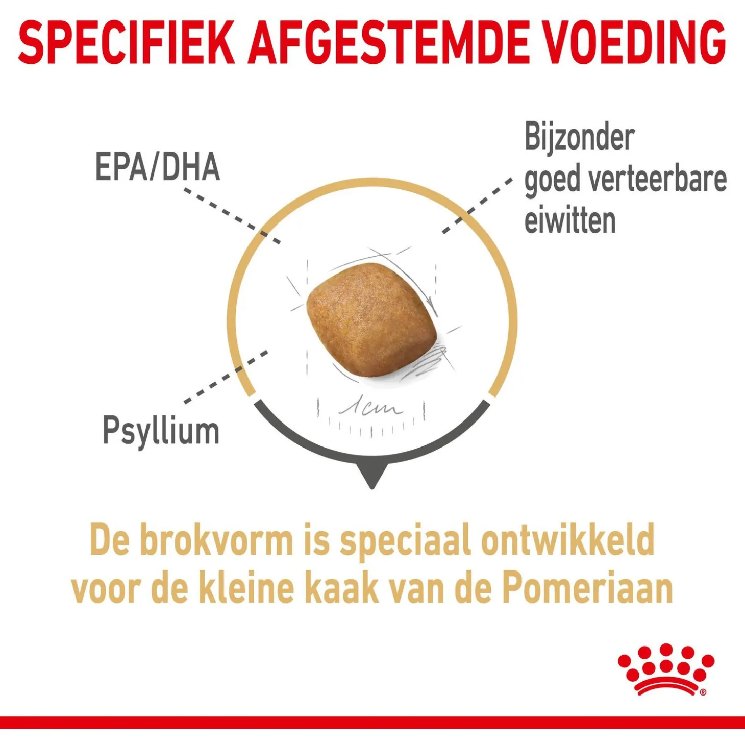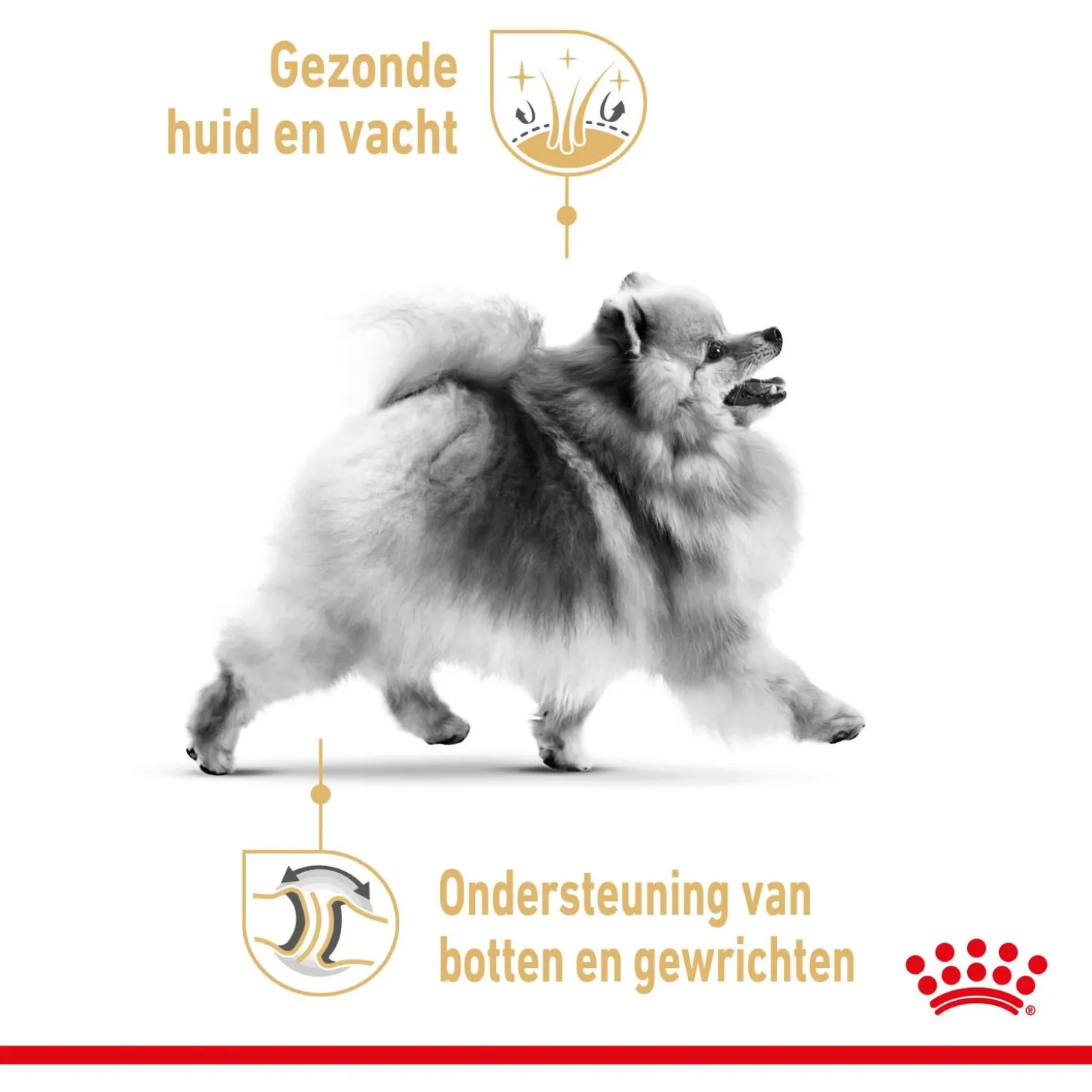 Om het eten makkelijker te maken, zijn de grootte, vorm en textuur van de brokjes aangepast aan de kleine kaak van je Pomeriaan. Daarnaast bevatten de brokjes calciumvangers die helpen om tandsteenvorming te verminderen en de gezondheid van het gebit te ondersteunen. Ook de botten en gewrichten worden ondersteund dankzij het aangepaste mineralengehalte.