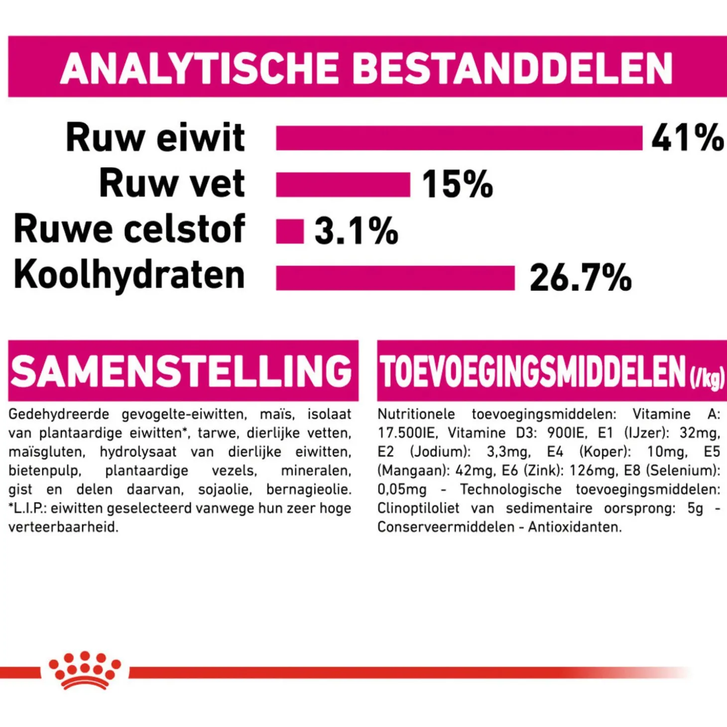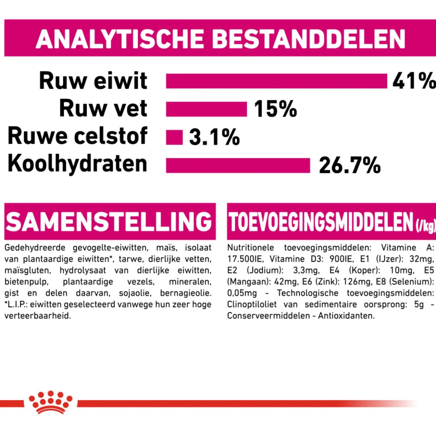 | Samenstelling | Maïs, isolaat van plantaardige eiwitten*, maïsgluten, tarwe, dierlijke vetten, plantaardige vezels, hydrolysaat van dierlijke eiwitten, bietenpulp, mineralen, sojaolie, bernagieolie, gedehydreerde gevogelte-eiwitten, gist en delen daarvan *l.i.p.: hoogwaardige eiwitten die zeer goed verteerbaar zijn. |