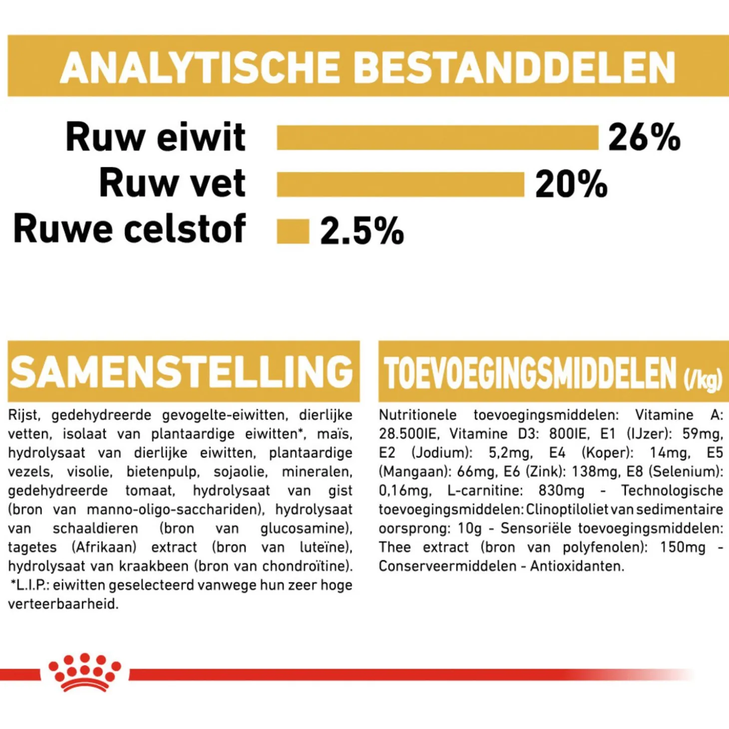 | Samenstelling | Gewicht: 3 kg. ingrediënten: rijst, plantenproteïne-isolaat gevogelte-eiwit (gedroogd), dierlijk vet, maïs dierlijk eiwit (gehydrolyseerd), mineralen, lignocellulose, gedroogde bietenpulp, visolie, sojaolie, kokosolie, gedroogde tomaten, gisthydrolysaat (rijk aan mannan-oligosaccharide), hydrolysaat uit schaaldieren (rijk aan glucosamine), druivenpitten en groene thee (rijk aan polyfenolen), tagetes-extract (rijk aan luteïne), hydrolysaat uit kraakbeen (rijk aan chondroïtine). |