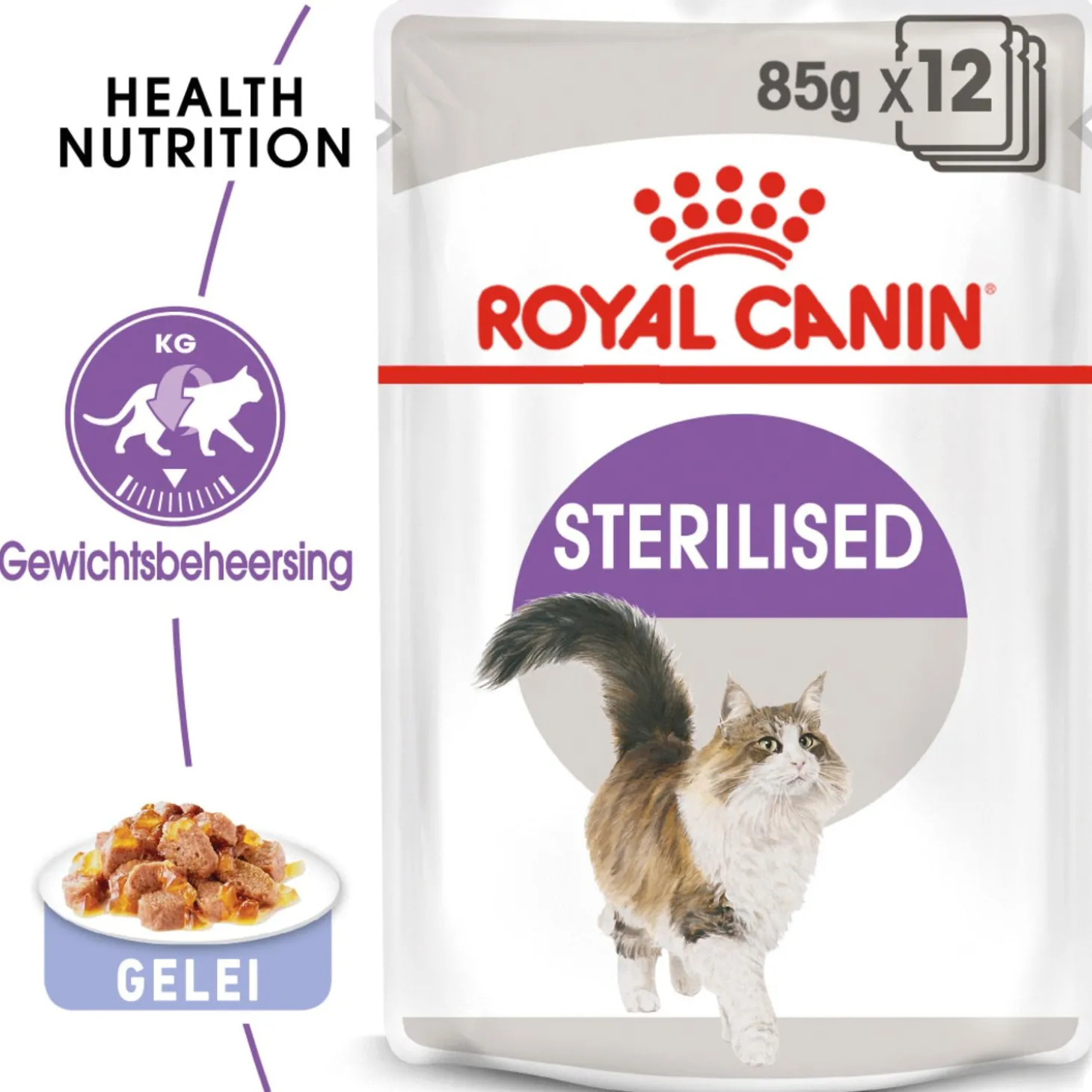 Royal Canin Sterilised in Jelly bevat 12 pouches van 85 gram.