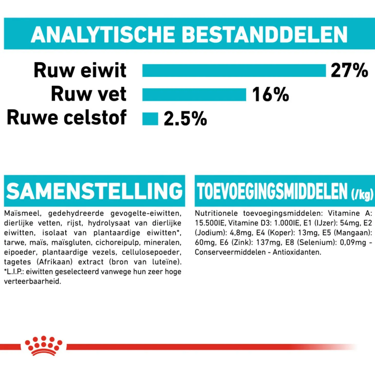 | Samenstelling | Maïsmeel, gedehydreerde gevogelte-eiwitten, dierlijke vetten, rijst, hydrolysaat van dierlijke eiwitten, isolaat van plantaardige eiwitten*, tarwe, maïs, maïsgluten, cichoreipulp, mineralen, eipoeder, plantaardige vezels, cellulosepoeder, tagetes (afrikaan) extract (bron van luteïne) *l.i.p.: hoogwaardige eiwitten die zeer goed verteerbaar zijn. |