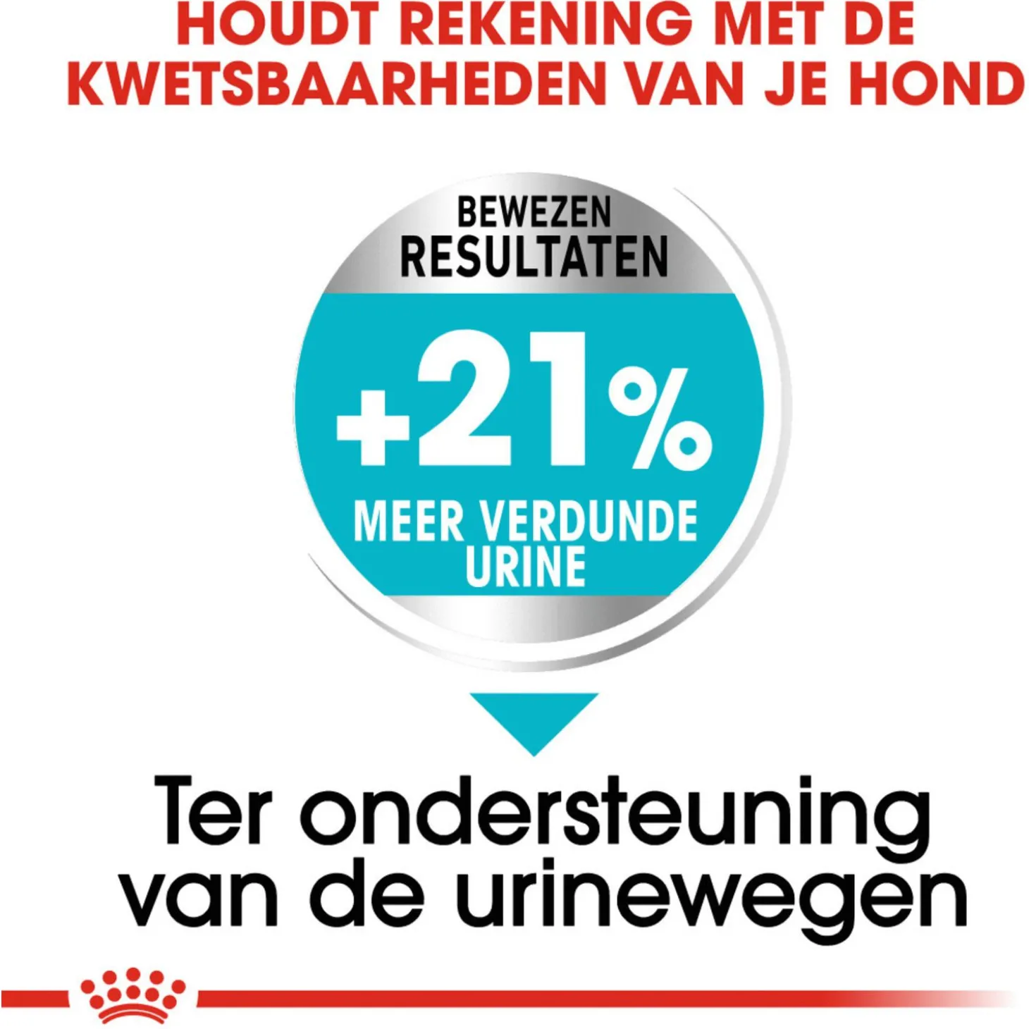 Deze brokken zijn speciaal ontwikkeld om je hond te helpen meer water te drinken. Dit heeft een dubbel effect: allereerst spoelt het de blaas van je hond. Daarnaast helpt het de urine verdunnen. Alle Royal Canin voedingen zijn geheel compleet en bevatten hoogkwalitatieve eiwitten, vetten, vezels, vitamines en mineralen die je hond nodig heeft ter ondersteuning van zijn gezondheid.