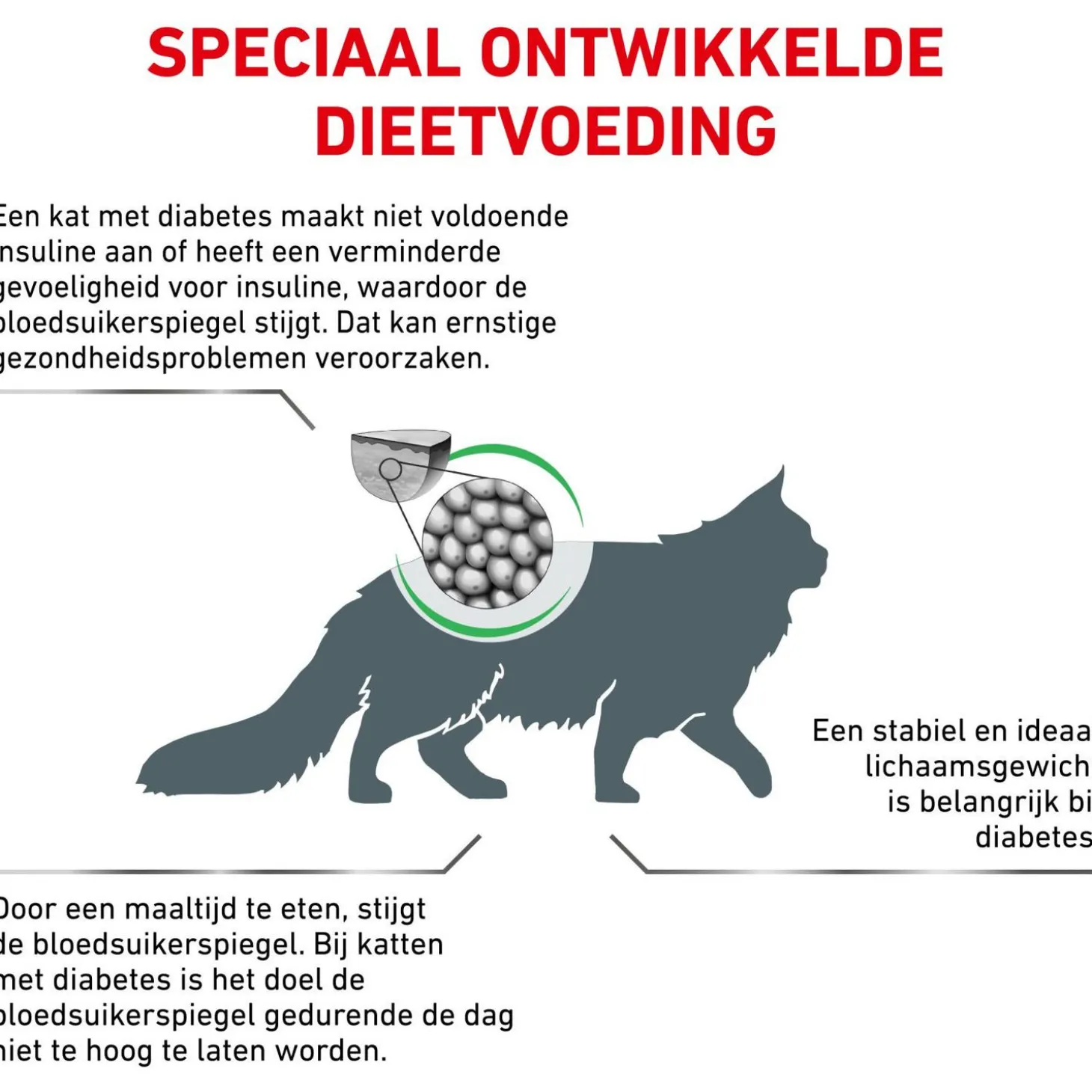 Suikerziekte komt regelmatig voor bij katten, jong en oud. Diabetes kan in de meeste gevallen goed behandeld worden met behulp van insuline en geschikte voeding. Diabetic van Royal Canin bevat specifieke koolhydraten die na de maaltijd geleidelijk door het lichaam worden opgenomen. Zo worden grote schommelingen in de bloedsuikerspiegel voorkomen.