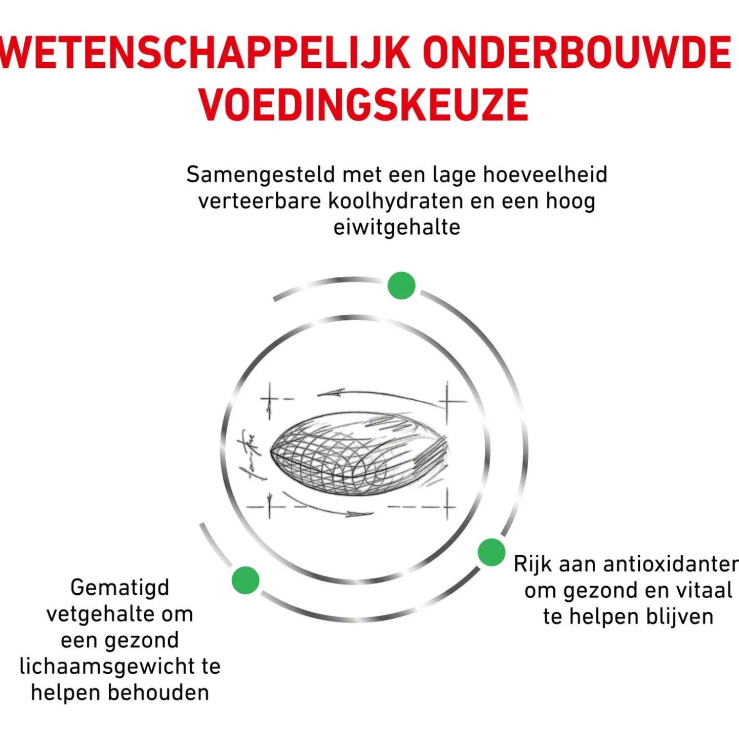 | Samenstelling | Gedehydreerde gevogelte-eiwitten, gerst, tarwegluten*, maïsgluten, isolaat van soja-eiwit*, tapioca, dierlijke vetten, hydrolysaat van dierlijke eiwitten, plantaardige vezels, cichoreipulp, mineralen, visolie, psylliumschil en psylliumzaden, fructo-oligo-sacchariden, sojaolie, tagetes (Afrikaan) extract (bron vanluteïne). Bronnen van koolhydraten: gerst, tapioca. |