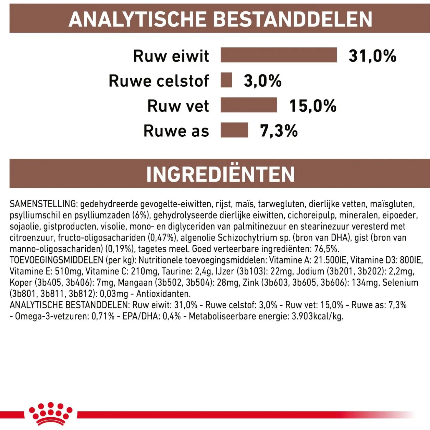 | Analyse | Ruw eiwit: 31,0% – Ruw vet: 15,0% – Ruwe as: 7,3% – Ruwe celstof: 2,9% – EPA & DHA: 0,33%. Toevoegingsmiddelen (per kg): Nutritionele toevoegingsmiddelen: Vitamine A: 23.000IE, Vitamine D3: 800IE, IJzer (3b103): 24mg, Jodium (3b201, 3b202): 2,4mg, Koper (3b405, 3b406): 7mg, Mangaan (3b502, 3b504): 31mg, Zink (3b603, 3b605, 3b606): 135mg, Selenium (3b801, 3b811, 3b812): 0,03mg-Conserveermiddelen-Antioxidanten. |