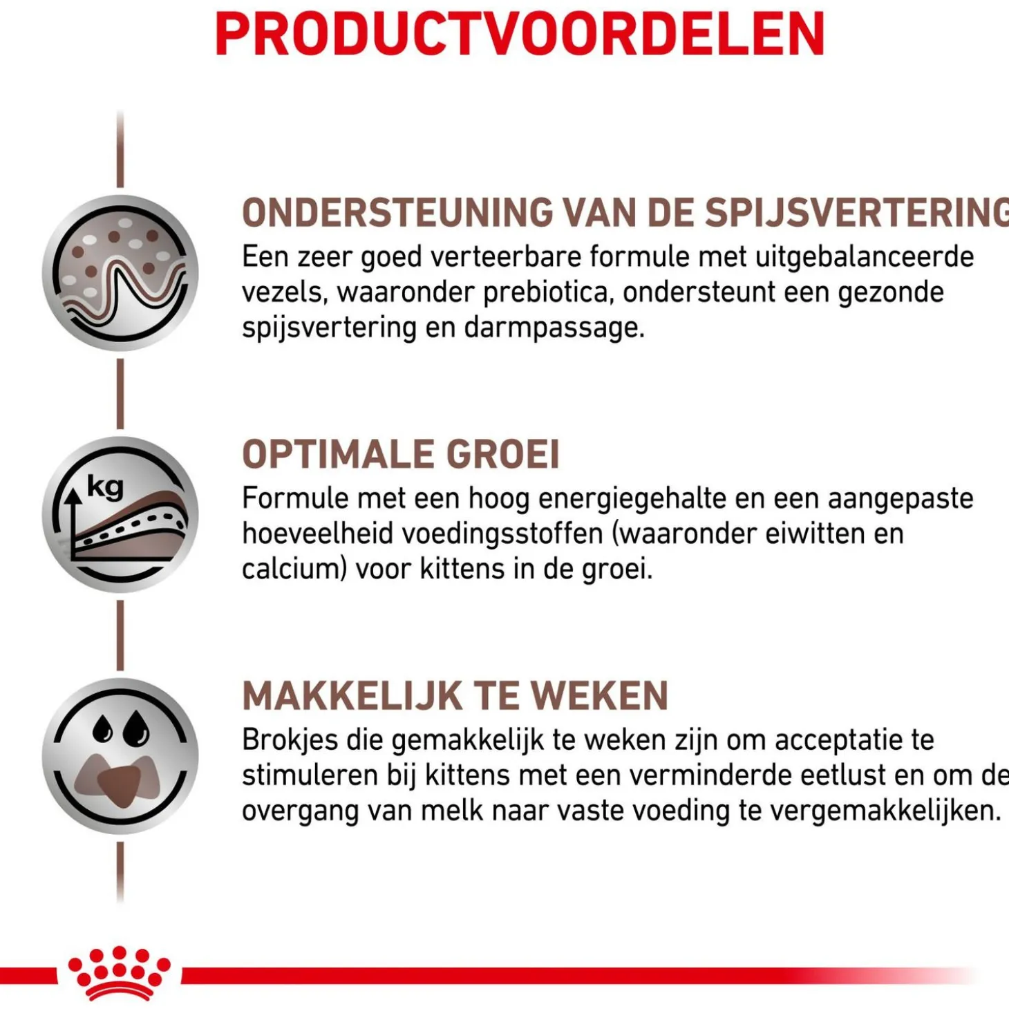De goed verteerbare formule zit vol met uitgebalanceerde vezels en prebiotica ter ondersteuning van de spijsvertering en om te zorgen voor een soepele passage door het maagdarmstelsel. De brokjes kunnen ook makkelijk geweekt worden zodat deze makkelijker te eten zijn voor kittens met een verminderde eetlust. Dit kan ook helpen bij de overgang van melk naar vast voedsel.