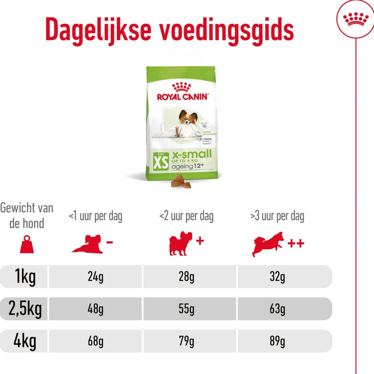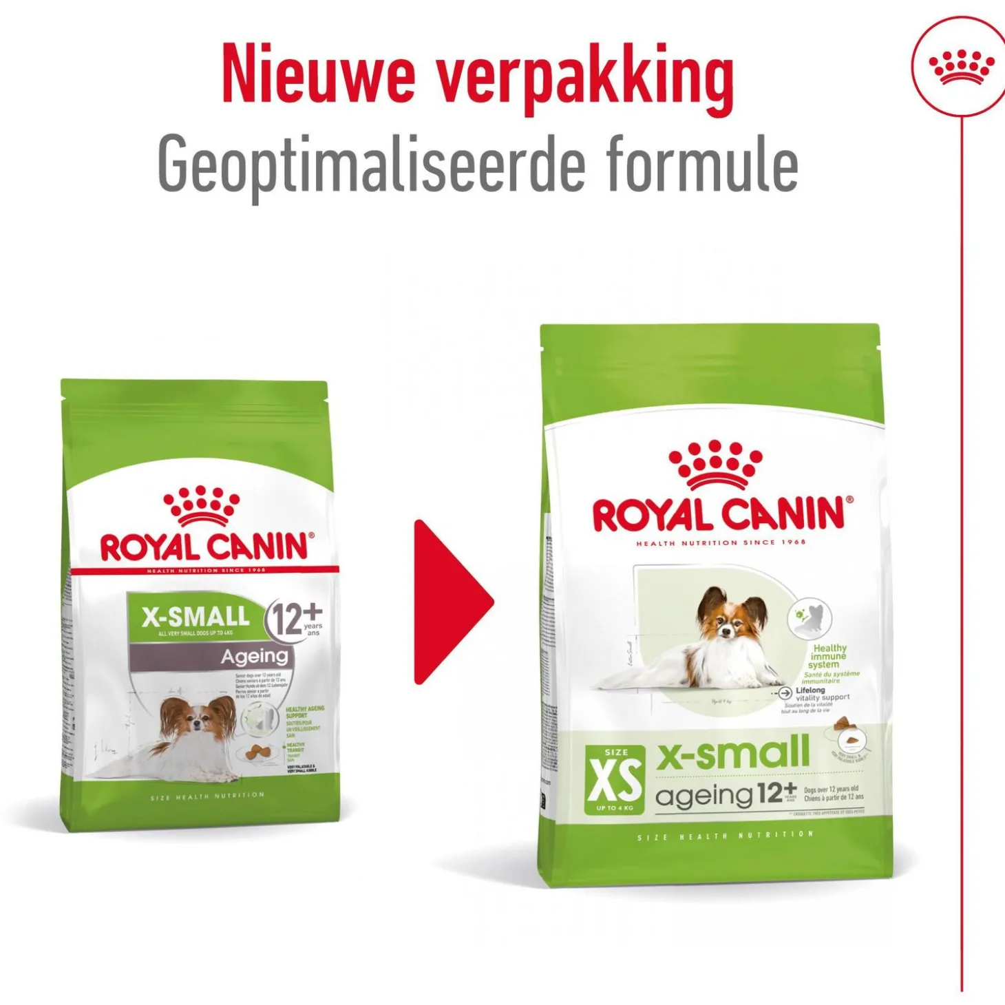 Royal Canin X-Small Ageing 12+ is verkrijgbaar in 500 gr en 1,5 kg.