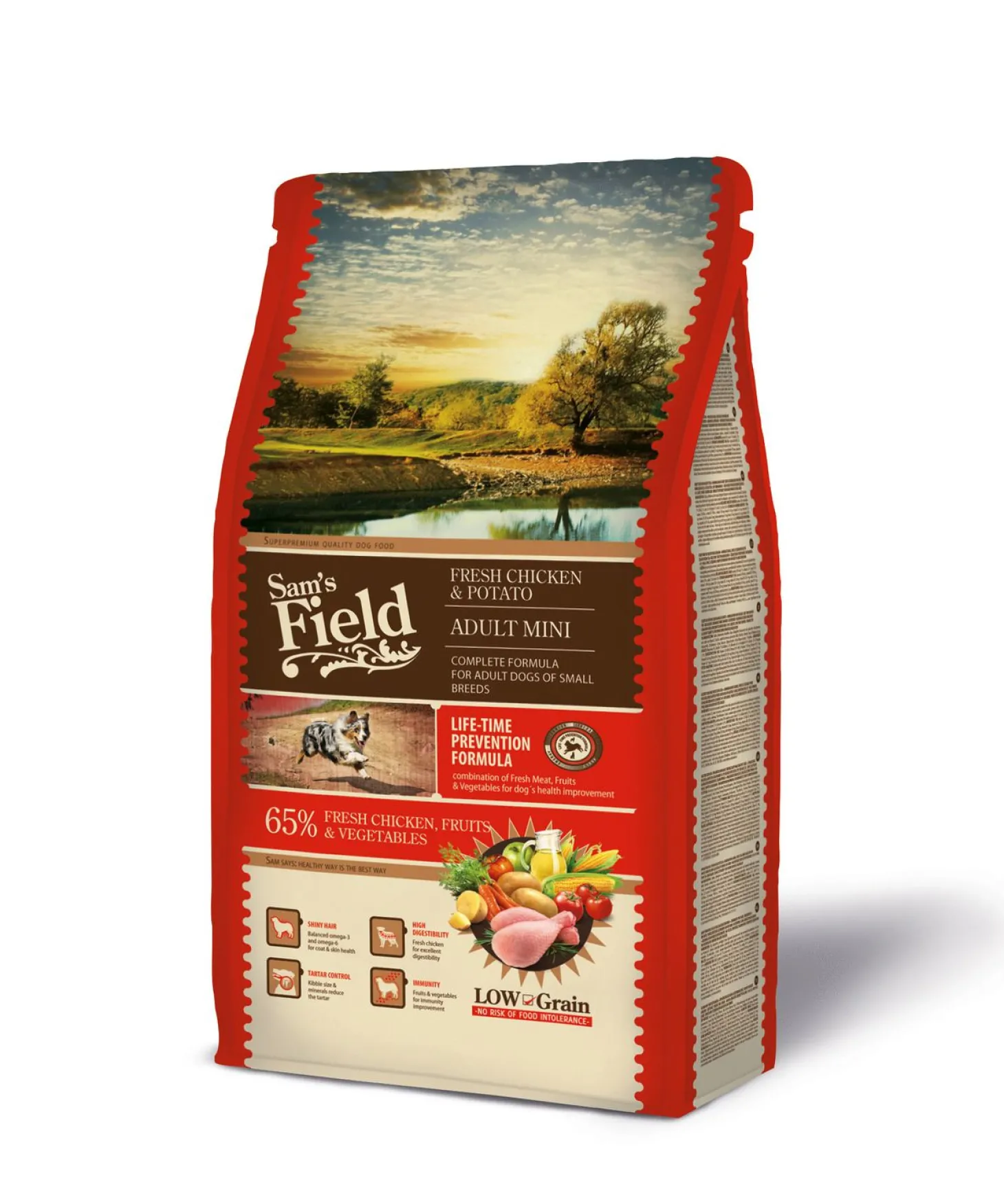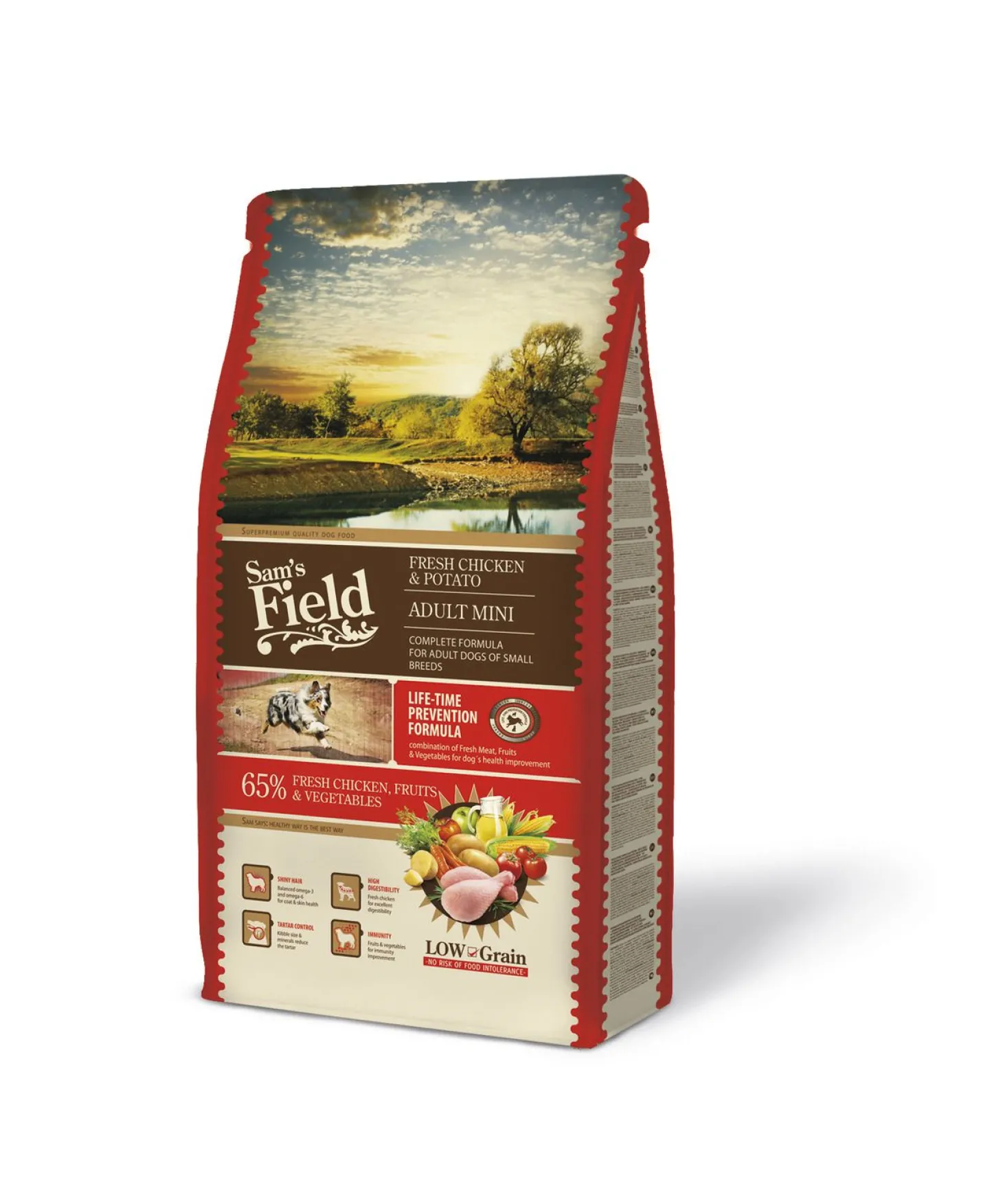 Sam’s Field Adult Mini Chicken & Potato is verkrijgbaar in 2,5 en 8 kg.