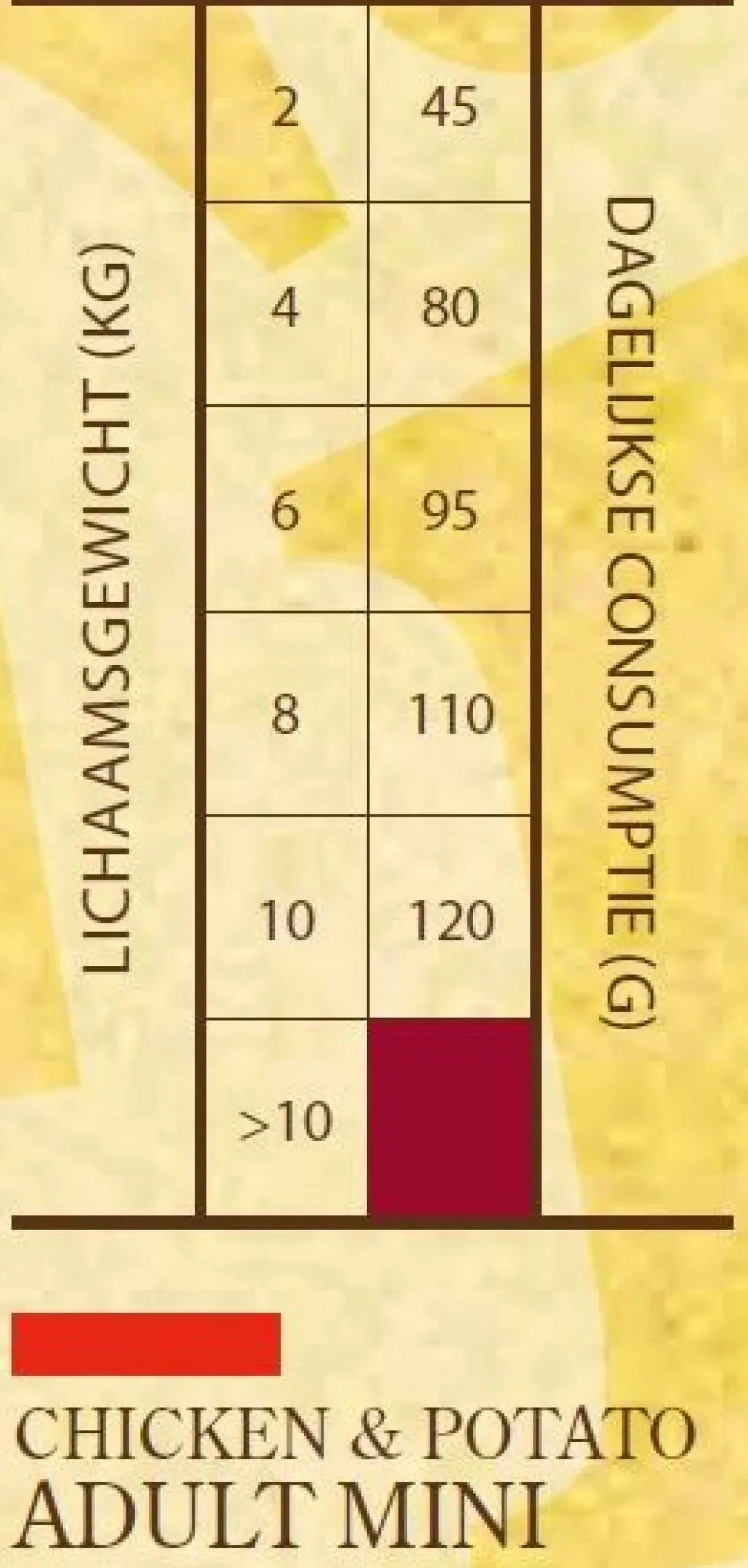 | Aanbeveling | De voeding kan droog of licht bevochtigd gegeven worden. Zorg ervoor dat jouw hond altijd voldoende schoon drinkwater heeft. De dagelijkse voedingsbehoefte van jouw hond kan anders zijn afhankelijk van zijn activiteit, omgeving, grootte en leeftijd. De aanbevolen dagelijkse hoeveelheid wordt weergegeven in de voedingstabel. Zorg ervoor dat jouw hond voldoende beweging krijgt en overvoer hem niet, op deze manier blijft jouw hond in optimale conditie. |