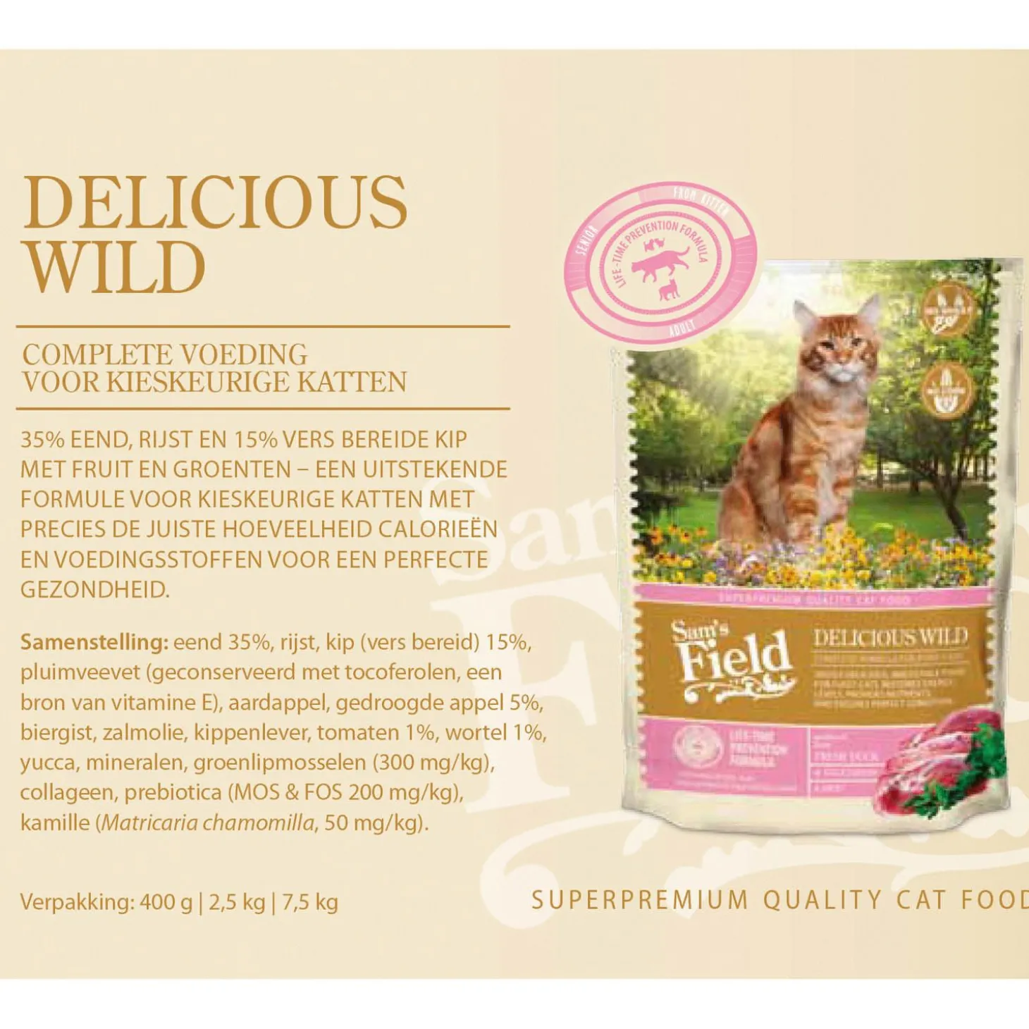 Sam’s Field Adult Delicious Wild is verkrijgbaar in 400 g, 2,5 kg en 7,5 kg.