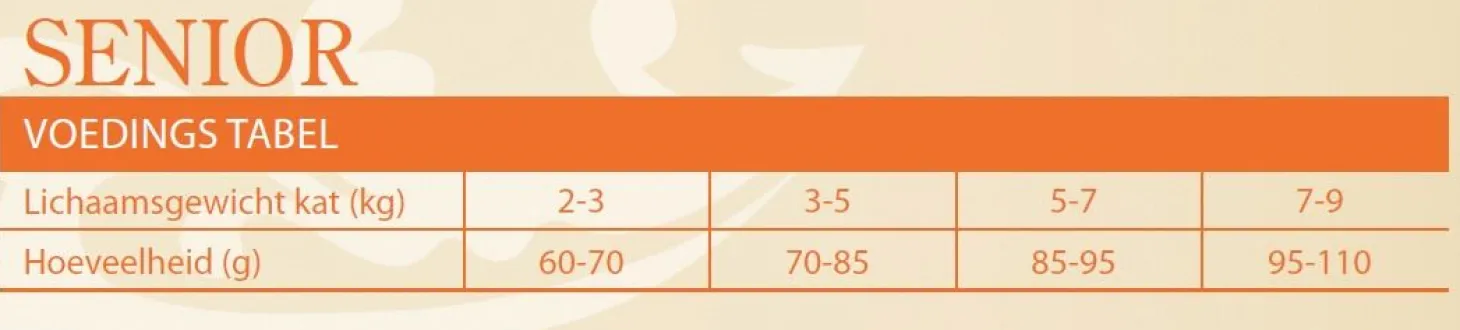 | Aanbeveling | De dagelijkse inname van voedingsstoffen volgens een vast schema speelt een belangrijke rol voor de gezondheid van jouw kat. Probeer altijd voor stabiele omstandigheden voor de voeding (plaats en tijd) en voor een bakje schoon water te zorgen. Als je meer dan één kat hebt, geef hun dan elk een eigen voerbakje. Geef het voer droog of bevochtigd met bouillon. Gebruik de voedingstabel op de verpakking om de juiste dagelijkse hoeveelheid te bepalen afhankelijk van de leeftijd en conditie van jouw kat. Zorg voor een goede band met jouw kat door regelmatig te spelen en te knuffelen. |