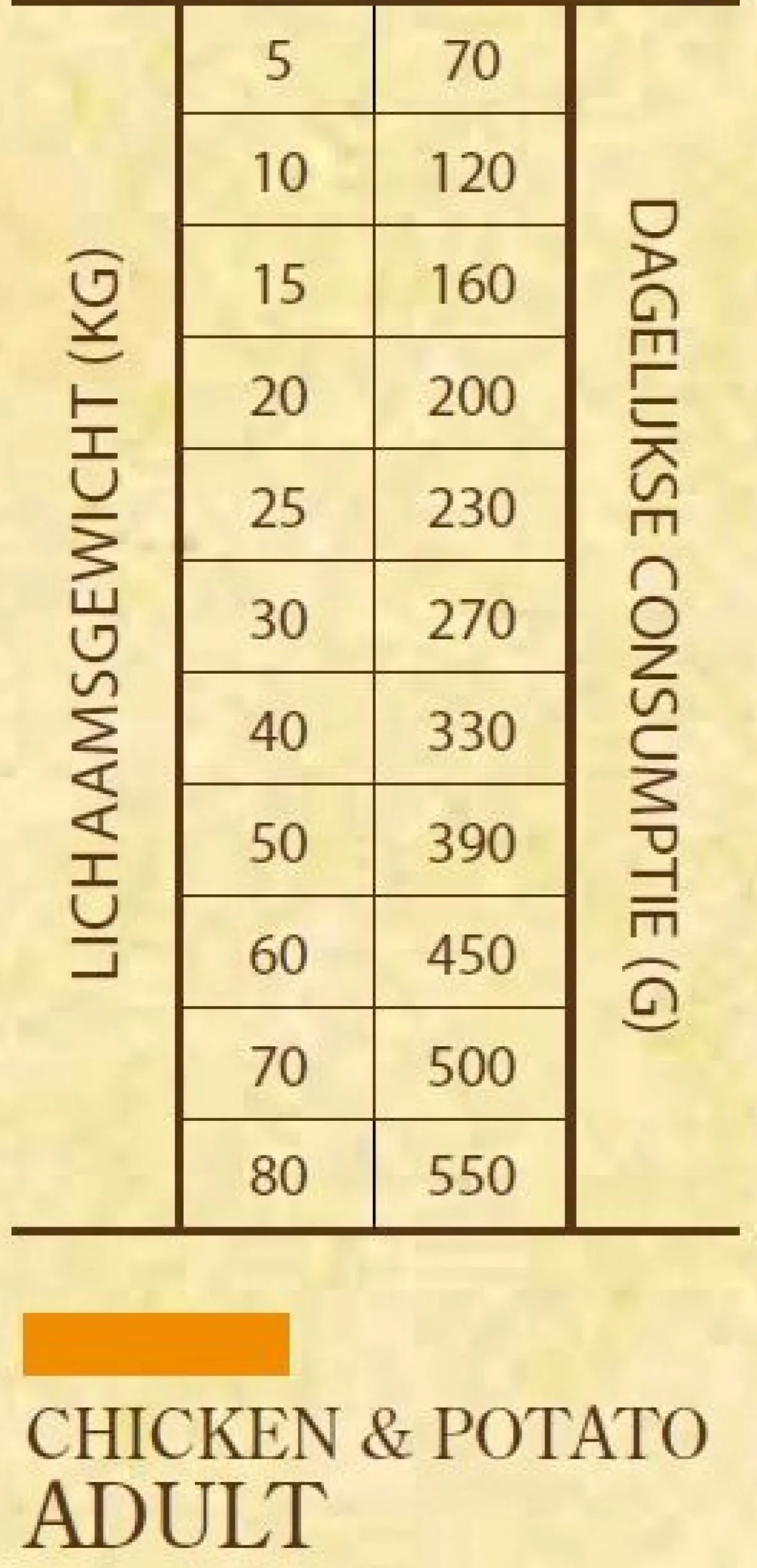 | Aanbeveling | De voeding kan droog of licht bevochtigd gegeven worden. Zorg ervoor dat jouw hond altijd voldoende schoon drinkwater heeft. De dagelijkse voedingsbehoefte van jouw hond kan anders zijn afhankelijk van zijn activiteit, omgeving, grootte en leeftijd. De aanbevolen dagelijkse hoeveelheid wordt weergegeven in de voedingstabel. Zorg ervoor dat jouw hond voldoende beweging krijgt en overvoer hem niet, op deze manier blijft jouw hond in optimale conditie. |