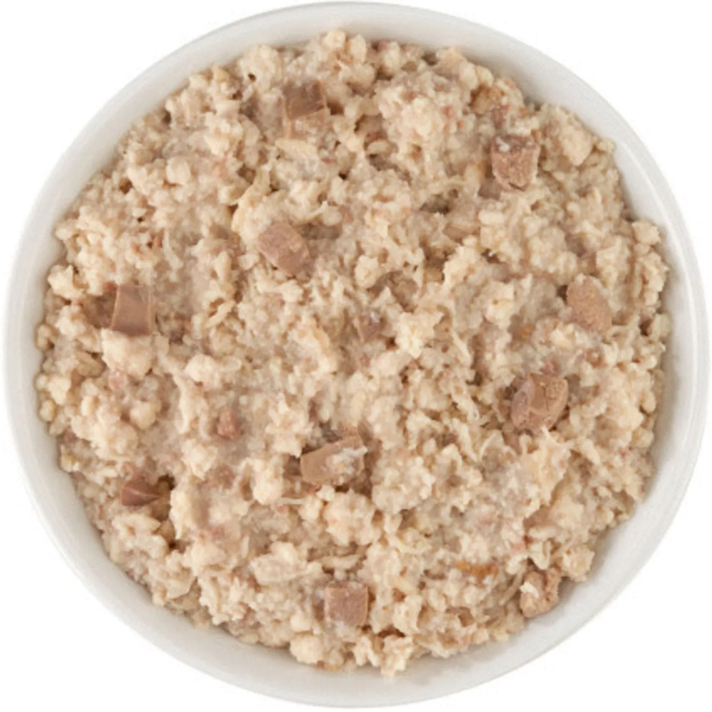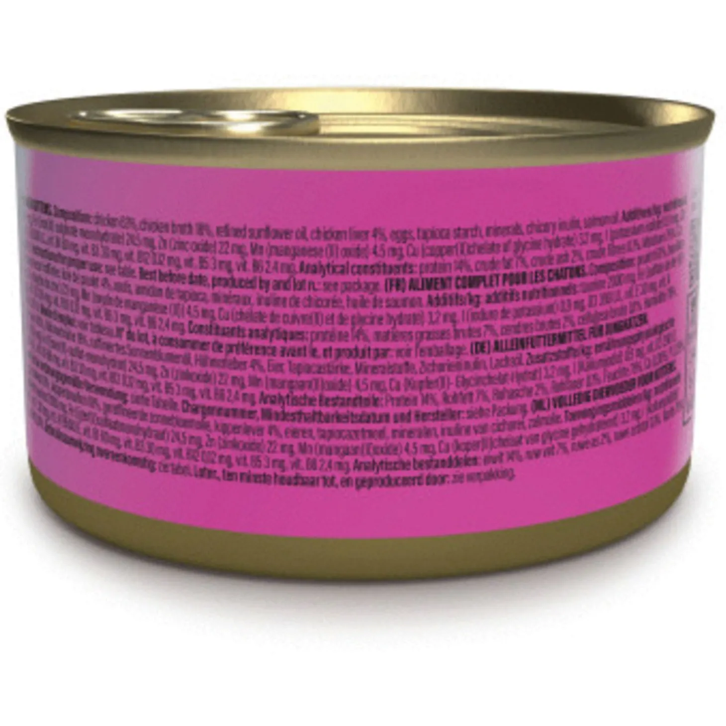 | Samenstelling | kip 63%, kippenbouillon 18%, geraffineerde zonnebloemolie, kippenlever 4%, zalm 4%, tapiocazetmeel, mineralen, cichorei-inuline, zalmolie. |