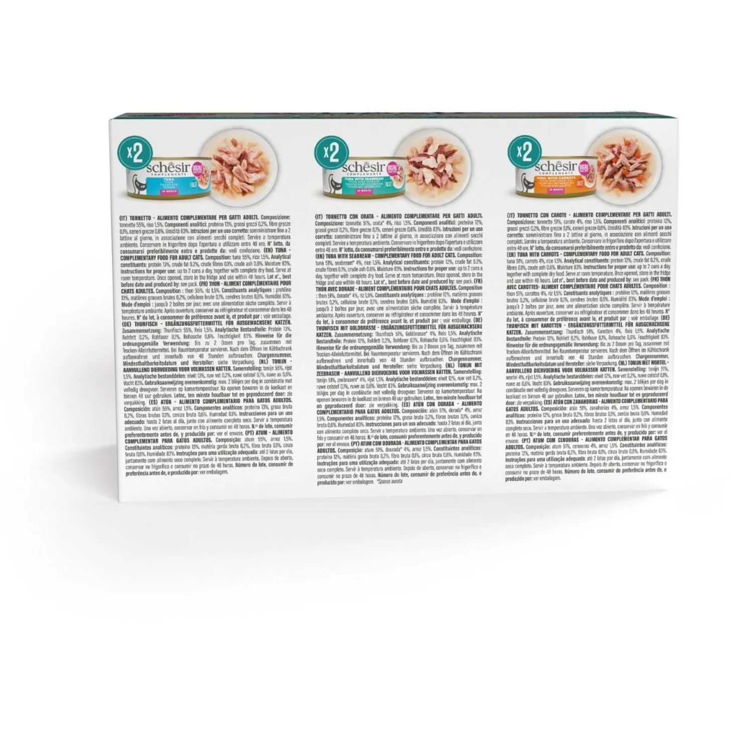 | Samenstelling | Tonijn 55%, Rijst 1.5%. Tonijn 51%, Zeebrasem 4%, Rijst 1.5%. Tonijn 51%, Wortels 4%, Rijst 1.5%. |