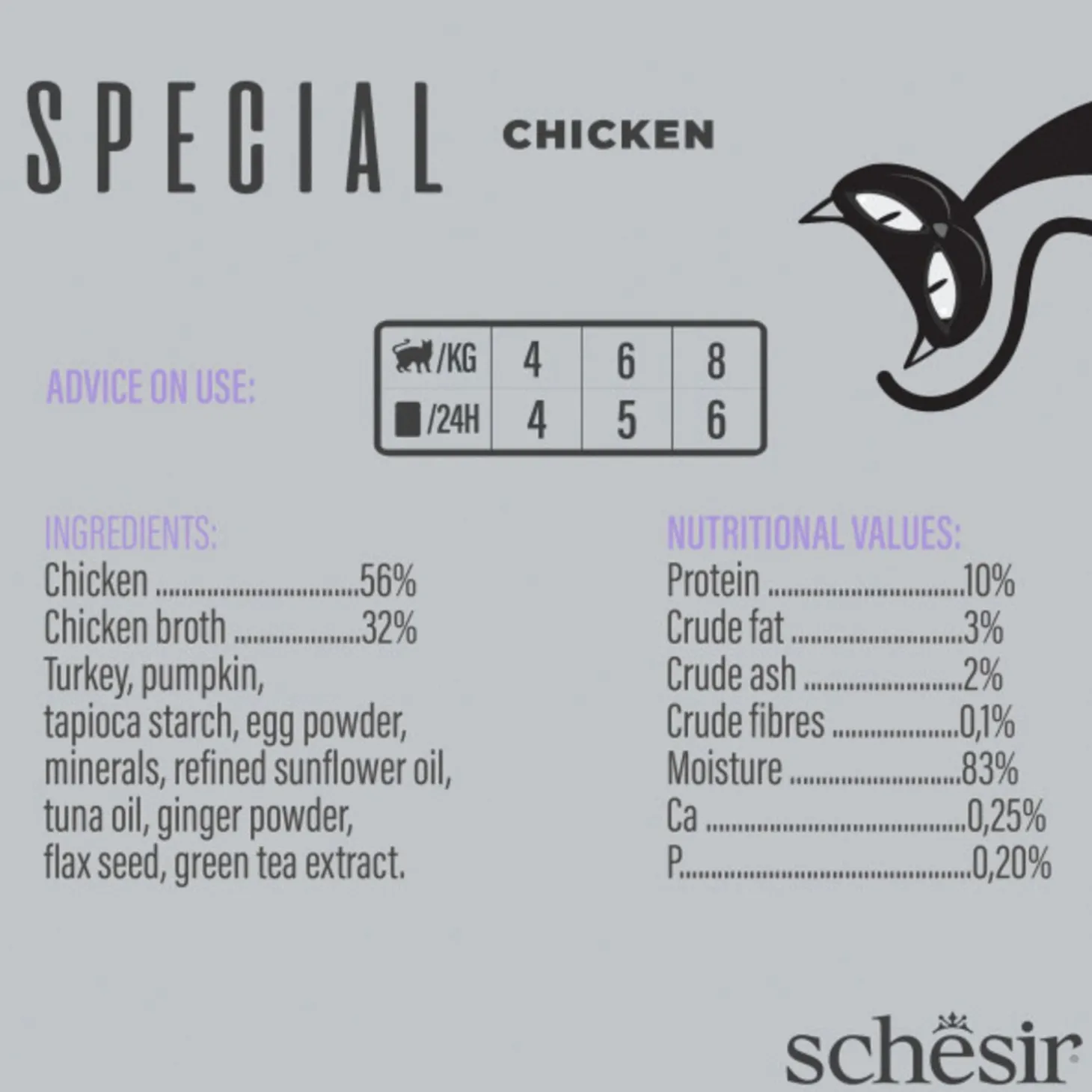 | Samenstelling | kip 56%, kippenbouillon 32%, kalkoen, pompoen, tapiocazetmeel, eipoeder, mineralen, geraffineerde zonnebloemolie, tonijnolie, gemberpoeder, lijnzaad, groene thee-extract. |