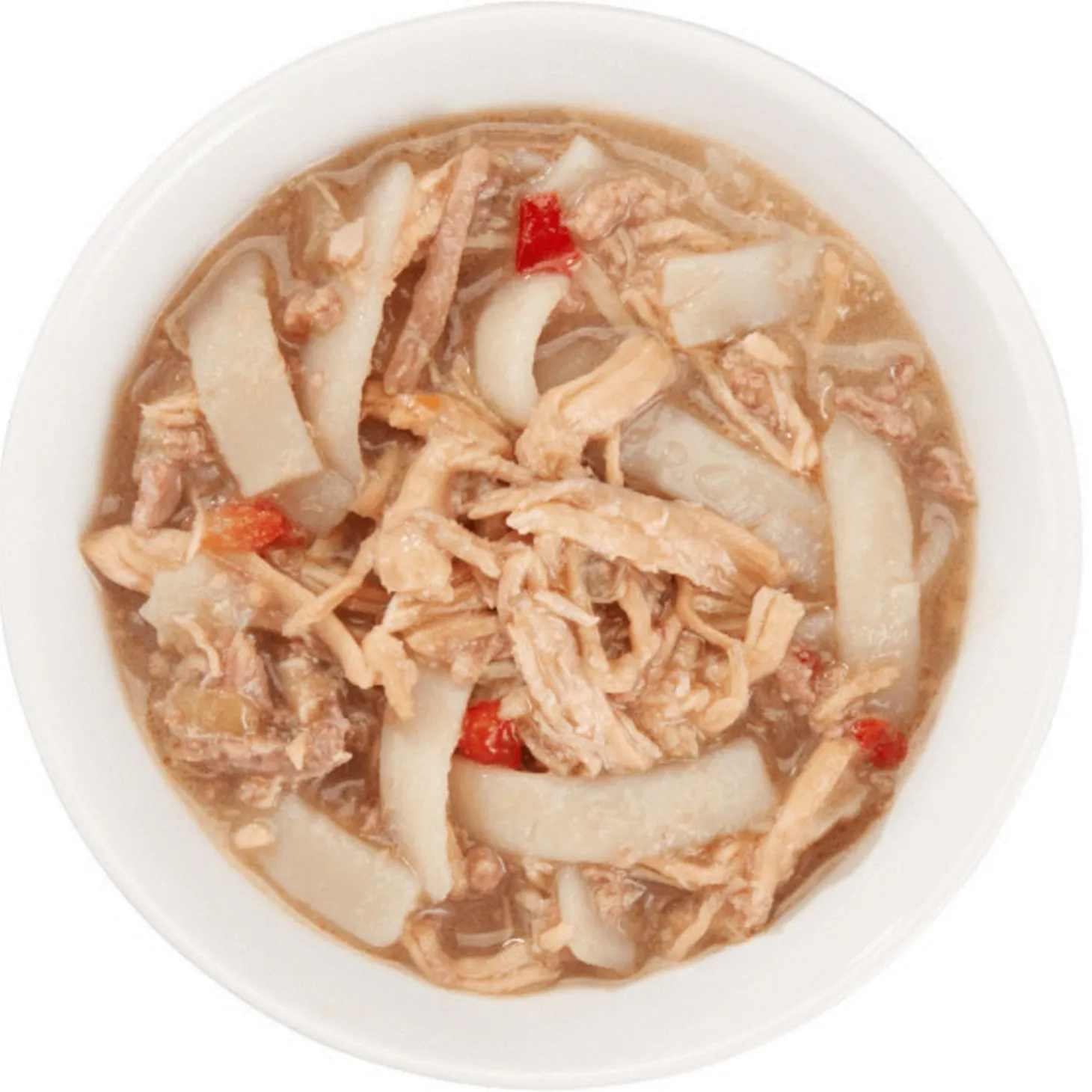 | Samenstelling | kip 41%, kippenbouillon 33%, bruine rijst 12%, wortelen 3%, peultjes 3%, mineralen, geraffineerde zonnebloemolie, paprika 2%, tapiocazetmeel, tonijnolie. |