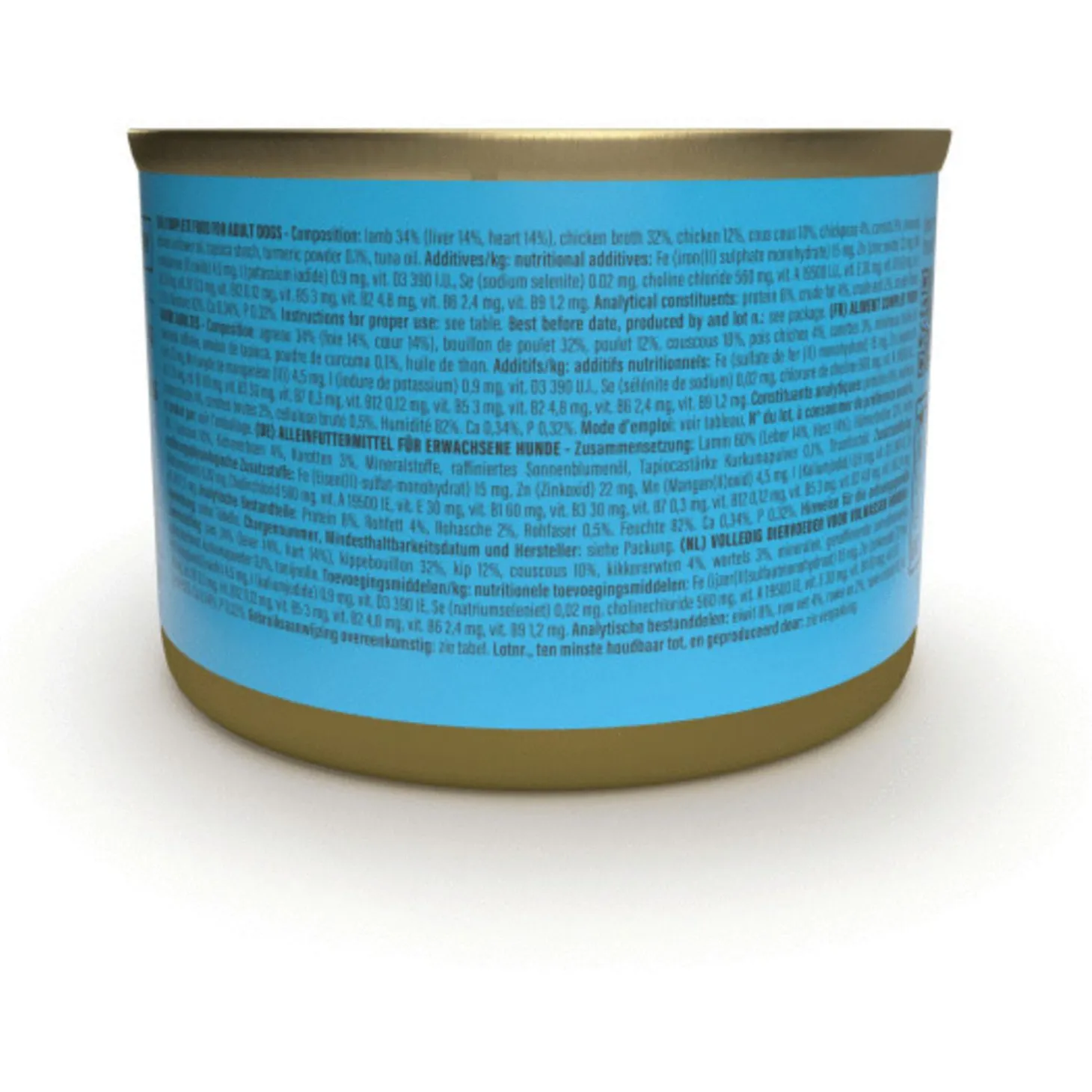 | Samenstelling | lamsvlees 34% (lever 14%, hart 14%), kippenbouillon 32%, kip 12%, couscous 10%, kikkererwten 4%, wortelen 3%, mineralen, geraffineerde zonnebloemolie, tapiocazetmeel, kurkumapoeder 0,1%, tonijnolie. |
