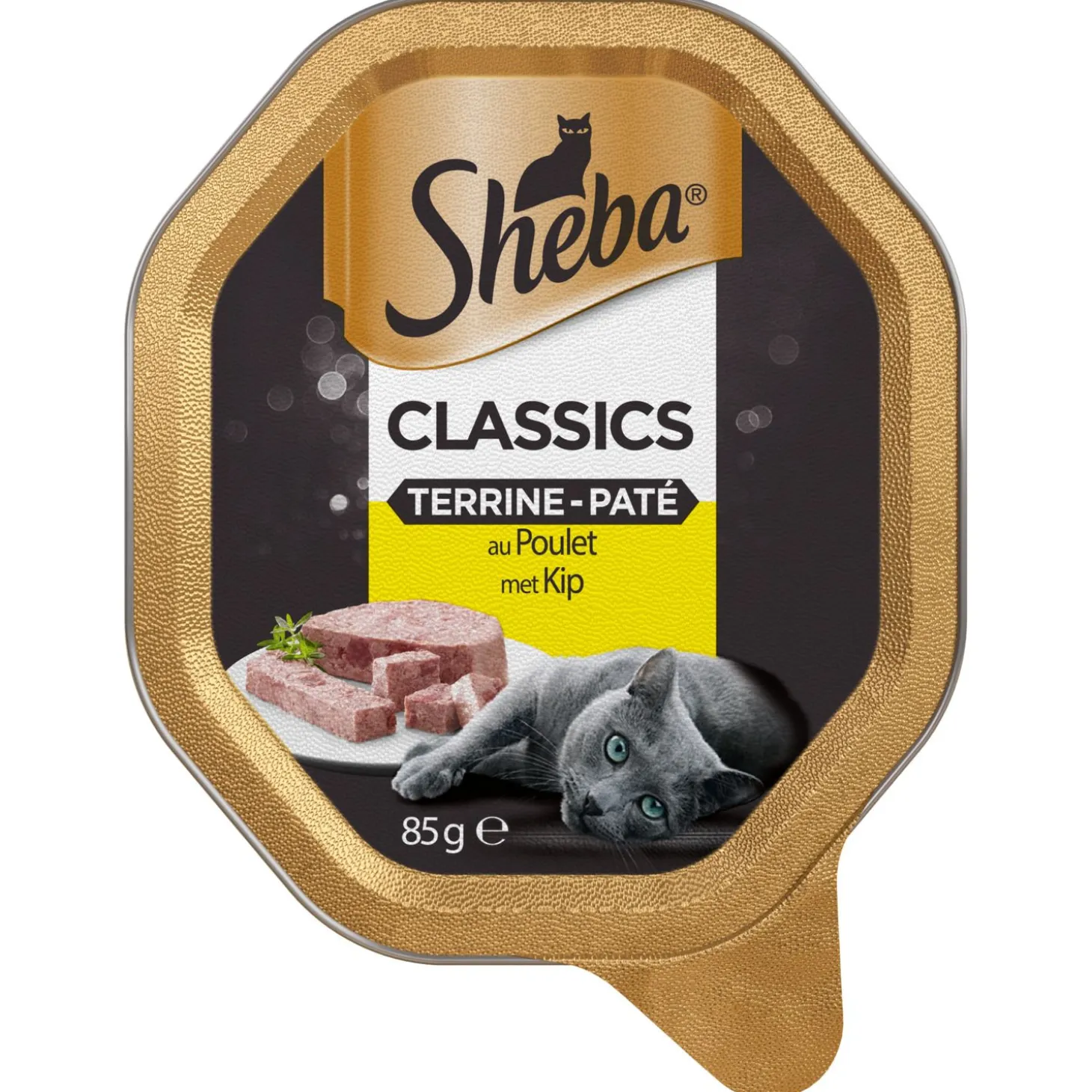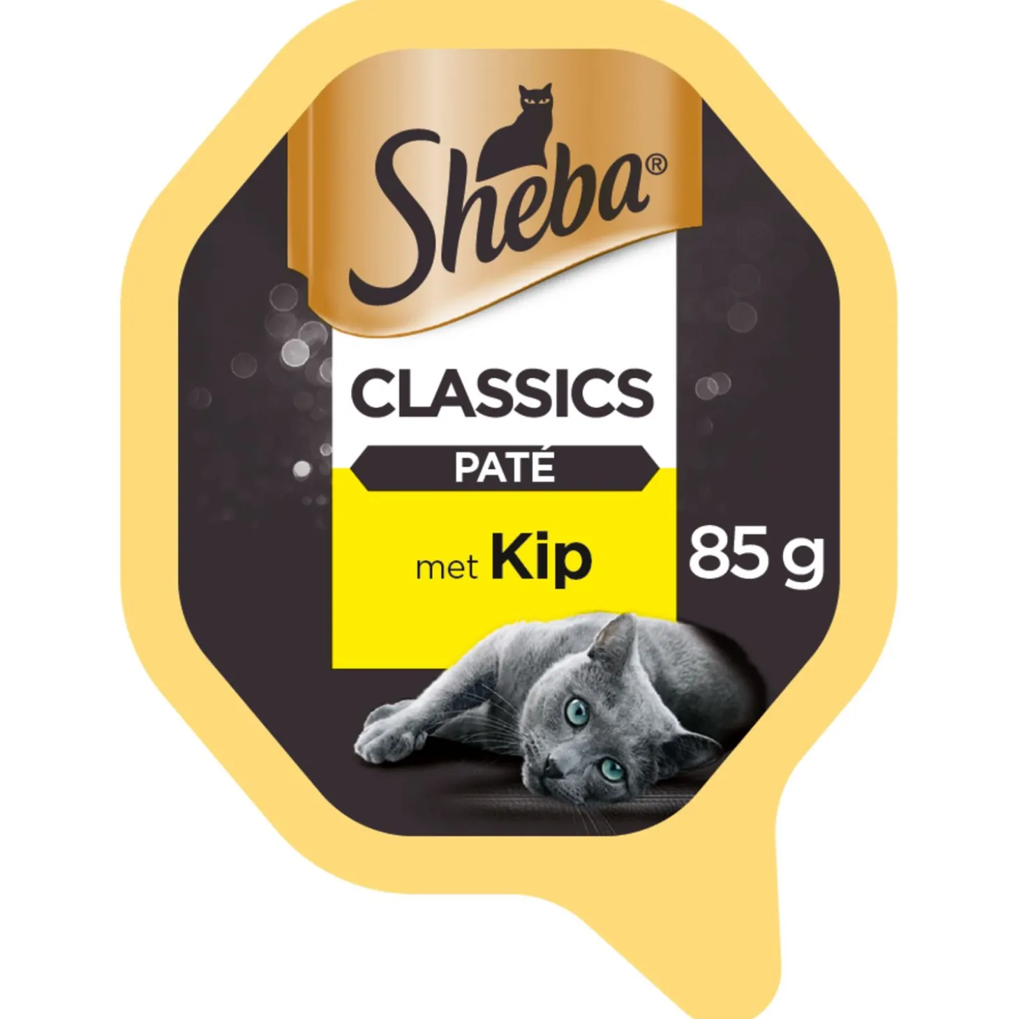 Sheba Classic Paté bevat 85 g en is verkrijgbaar in de smaken kip, rund en zalm.