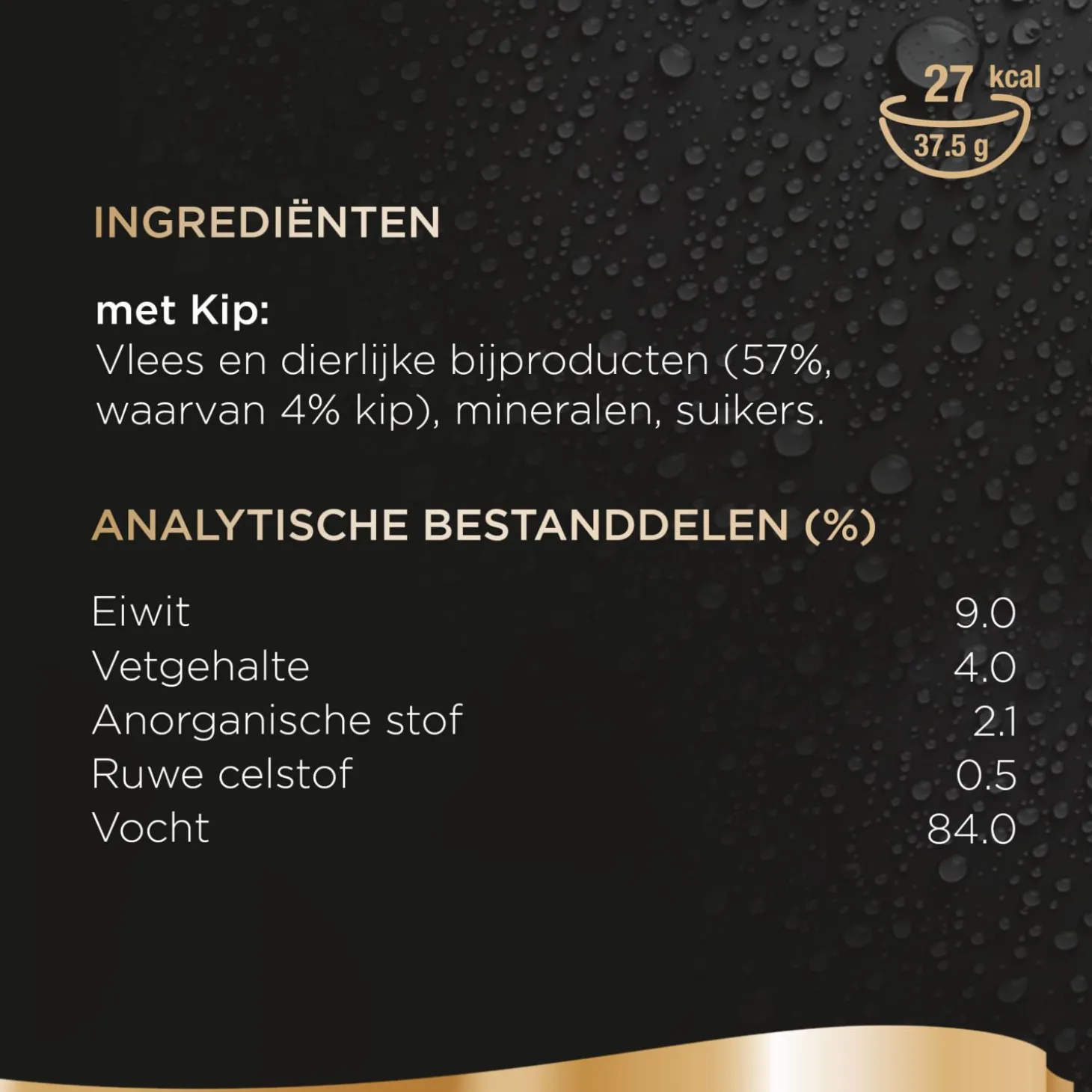 | Samenstelling | Samenstelling: vlees en dierlijke bijproducten (59%, waarvan kip 4%), mineralen, suikers. |