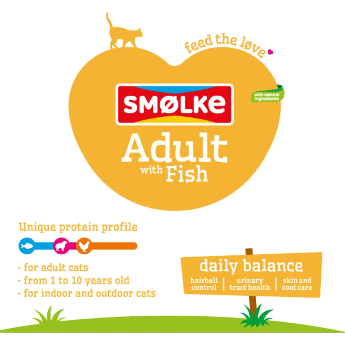Een complete kattenvoeding met natuurlijke ingrediënten wat elke dag weer zorgt voor een blije en tevreden kat, dat is Adult Fish and Rice kattenvoeding van Smølke. Deze brokjes bevatten alles wat je kat nodig heeft om iedere dag in balans te zijn. Het voer is geschikt voor volwassen katten vanaf 1 jaar tot 8 jaar oud.