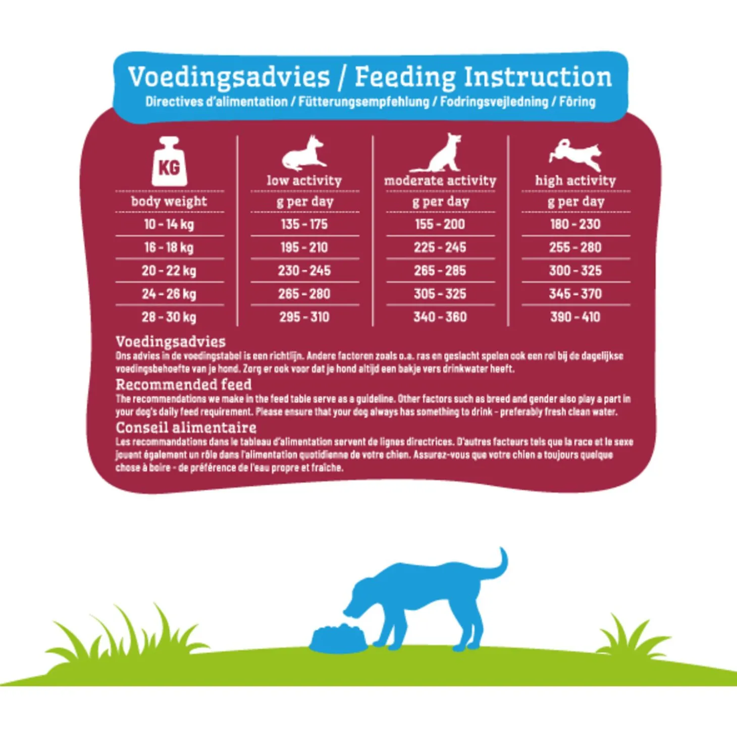 | Aanbeveling | Zie voedingstabel op de verpakking. Ons advies in de voedingstabel is een richtlijn. Andere factoren zoals o.a. ras en geslacht spelen ook een rol bij de dagelijkse voedingsbehoefte van je hond. Zorg er ook voor dat je hond altijd een bakje vers drinkwater heeft.||Die Empfehlung in der Tabelle ist ein Richtlinie. Der genaue Bedarf hängt von verschiedenen Faktoren ab, wie Geschlecht und Rasse. Bitte immer frisches Trinkwasser bereitstellen.||Les recommandations dans le tableau d’alimentation servent de lignes directrices. D’autres facteurs tels que la race et le sexe jouent également un rôle dans l’alimentation quotidienne de votre chat. Assurez-vous que votre chat a toujours quelque chose à boire – de préférence de l’eau propre fraîche.||The recommendations we make in the feed table serve as a guideline. Other factors such as breed and gender also play a part in your dog’s daily feed requirement. Please ensure that your dog always has something to drink — preferably fresh clean water.||Anbefalingerne i foderet tabel kan tjene som en rettesnor. Andre faktorer som race og køn spiller også en rolle i din kats daglige ernæringsbehov. Sørg for, at din kat altid har noget at drikke – helst frisk rent vand.||De rekommendationer i fodertabellen fungera som en riktlinje. Andra faktorer såsom ras och kön spelar också en roll i din katts dagliga foderbehov. Se till att din katt har alltid något att dricka – helst färskt rent vatten. |