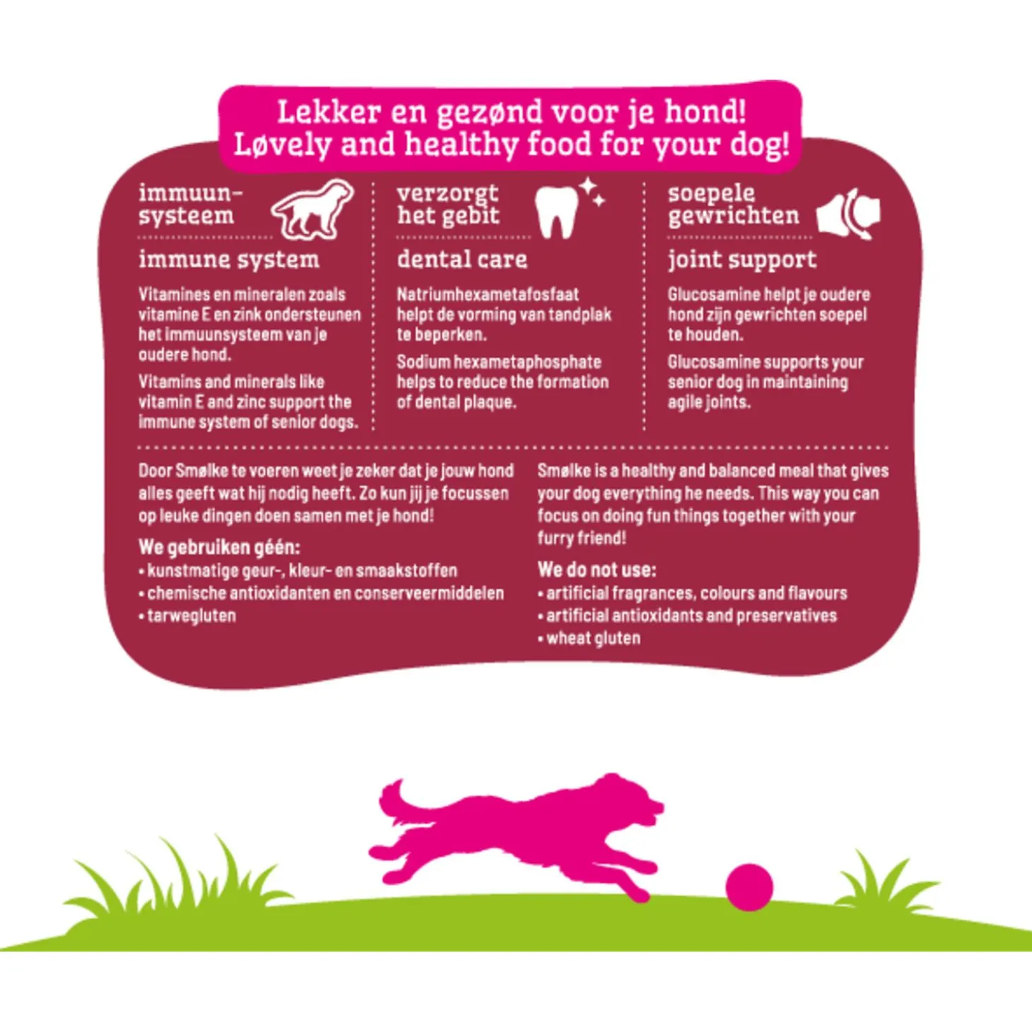 Een complete hondenvoeding met natuurlijke ingrediënten wat elke dag weer zorgt voor een vitale en tevreden hond, dat is Senior Medium hondenvoeding van Smølke. Dit hondenvoer voor je oudere, middelgrote viervoeter (tussen de 10 en 30 kg) bevat alles wat hij nodig heeft om iedere dag in balans te zijn. Het voer is geschikt voor honden vanaf 7 jaar oud.