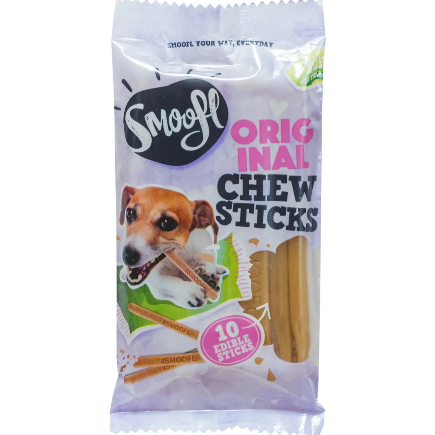 De eetbare ijsstokjes zijn lactose-, graan-, gluten- en vetvrij en zijn zo voor vrijwel elke hond geschikt. Het zakje bevat 10 stokjes die je kunt combineren met de andere Smoofl producten, die je los kunt geven of die je kunt gebruiken voor je zelfgemaakte hondenijsjes. Geef niet meer dan 1 stokje per dag.