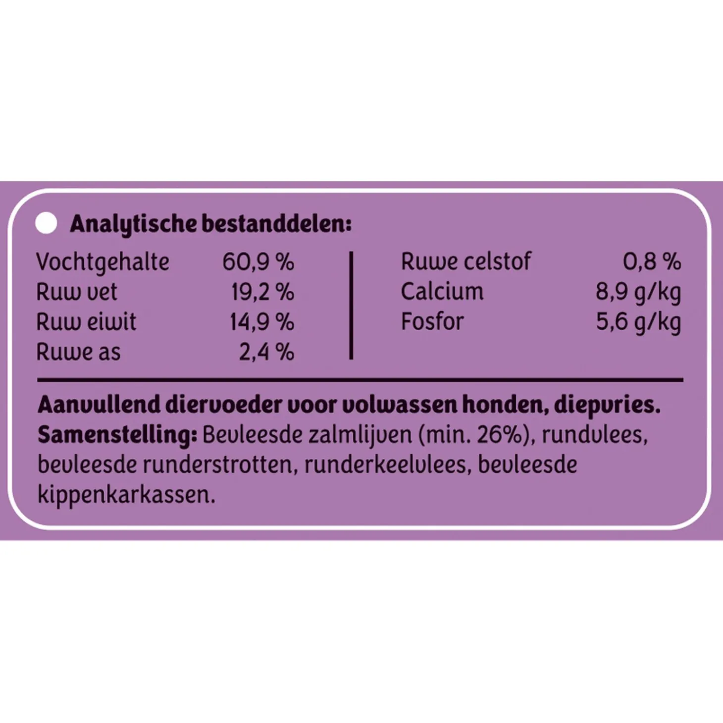 | Samenstelling | Samenstelling: Bevleesde zalmlijven (26,3%), rundsteekvlees, bevleesde kipkarkassen, rundvlees, runderkeelvlees |