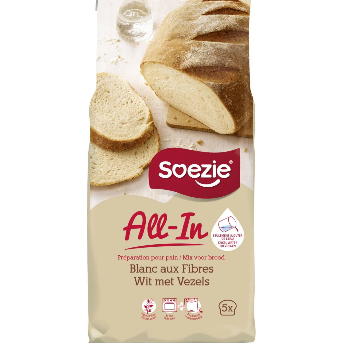 Kneed 500g All-in-mix met 320ml water tot een soepel deeg (ca. 20 min.). Bedek met plastic en laat 30 à 40 min. rijzen. Druk het deeg plat en geef het de gewenste vorm. Leg het in een ingevette bakvorm. Laat 40 min rijzen onder plastic. Bak 30 à 35 min. in een voorverwarmde over op 220°C.