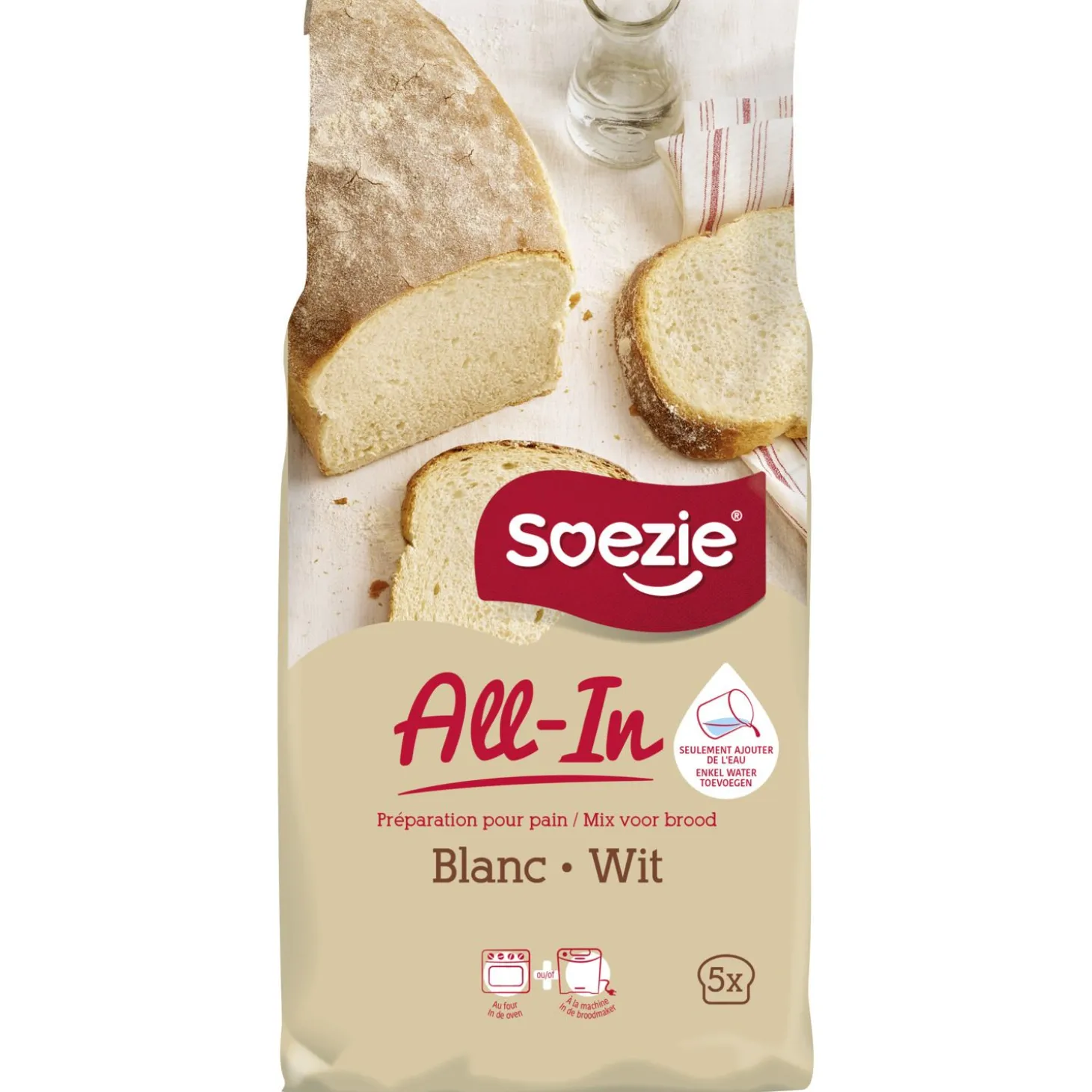 Kneed 500g All-in-mix met 290ml water tot een soepel deeg (ca. 20 min.). Bedek met plastic en laat 30 à 40 min. rijzen. Druk het deeg plat en geef het de gewenste vorm. Leg het in een ingevette bakvorm. Laat 40 min rijzen onder plastic. Bak 30 à 35 min. in een voorverwarmde over op 220°C.